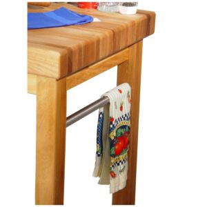The Yorktown Butcher Block Kitchen Island has a simple look, yet provides ample functionality. This item is made from oil-finished natural yellow birch hardwood, which is indigenous to the Northeastern U.S. and ranges in color from blond to a darker walnut shade; the natural variation in color allows this kitchen island to coordinate with your existing decor. The Yorktown features a spacious working surface ideal for food preparation. Two stainless steel towel bars on either side are placed right within reach.