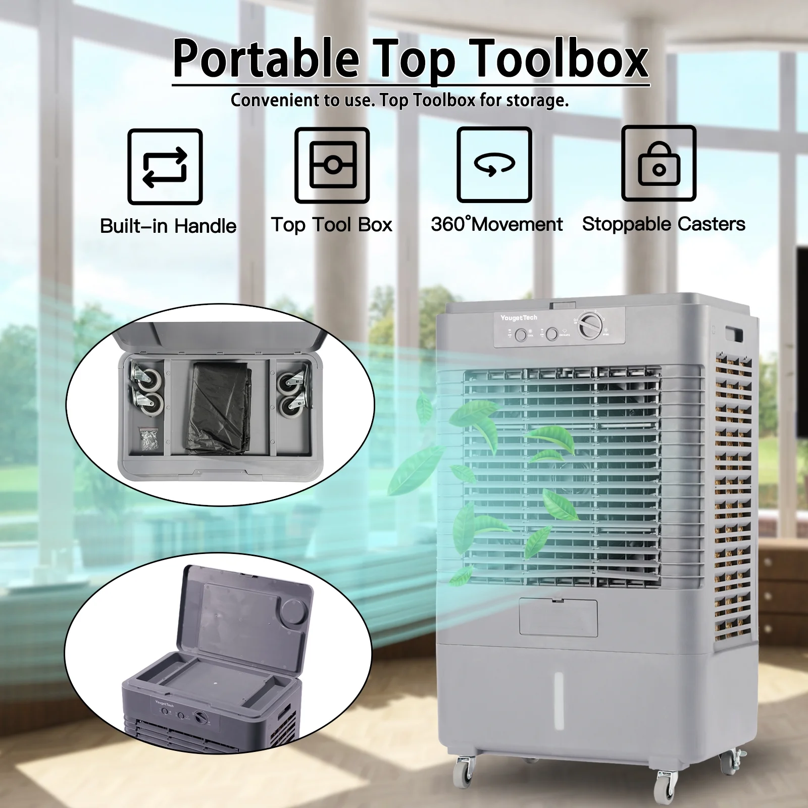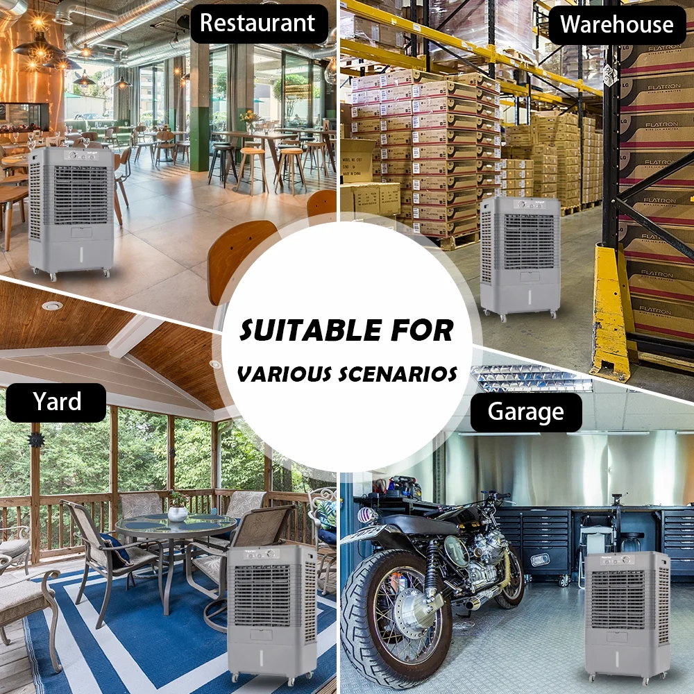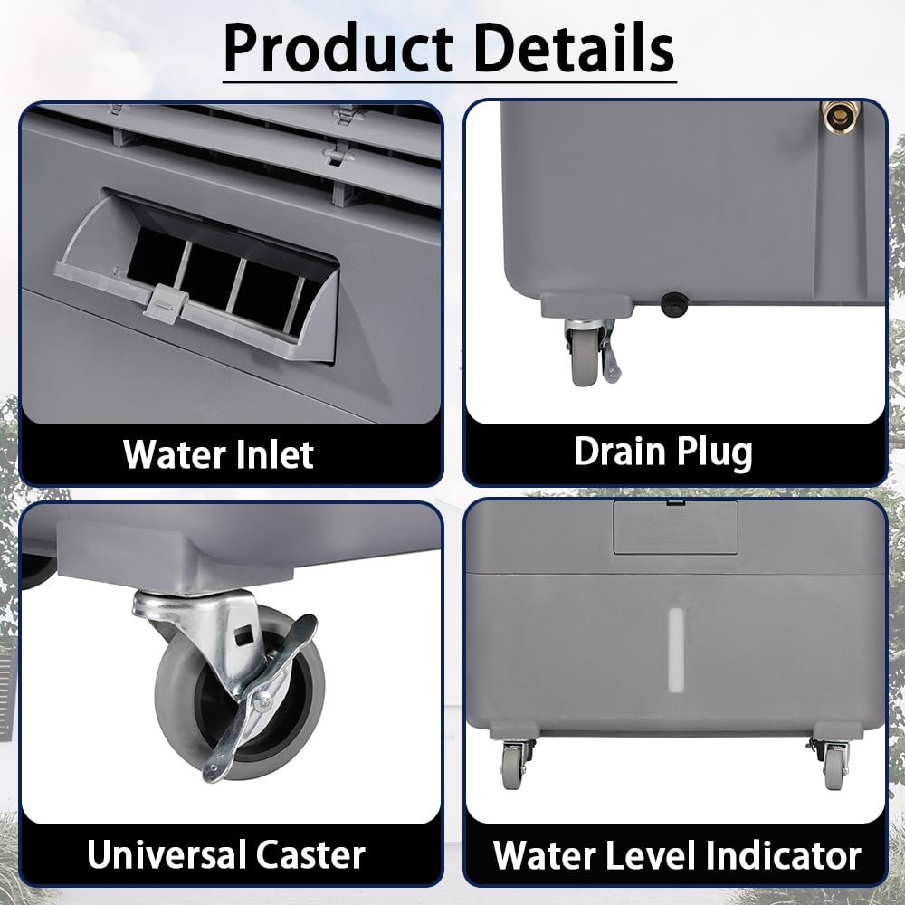 【LARGE COVERAGE AREA, 3000CFM AIR VOLUME】 It’s a 3-in-1 portable cooling fan that blows, humidifies, and cools the air. With its 90 ° horizontal oscillation and 90 ° vertical oscillation, the Evaporative Air Cooler can expel 3000 cubic feet of cold air per minute and distribute it to up to 720 square feet space. This would be an excellent alternative to air conditioners. 【30L/8GAL LARGE TANK & AUTOMATIC REFILLING】 Featuring a large 8-gallon water tank that can keep the cooler working for 5-8 hours. The water level indicator helps you monitor the water usage. You can manually add water from the water inlet or connect the garden hose to refill automatically. 【4 ROLLING CASTERS for MAX MOBILITY】YougetTech Evaporative Air Cooler features 4 heavy-duty 360-degree wheels (2 with brakes,2 without brakes). The universal wheel, dust proof bag, copper interface, and other components are placed in the top tool box. There are flexible handles on both sides of the cooler, you can move it to any space. 【ENERGY-SAVING & ECO-FRIENDLY COOLING】The evaporative air cooler doesn’t have a compressor and doesn’t add refrigerant, which not only saves energy but also protects the environment. The three-sided 3D honeycomb cooling pad offers enhanced cooling performance compared to other Cellulose cooling pads, is more absorbent and permeable, and is easy to maintain. The rated power is 160W. 【EASY to OPERATE】The built-in mechanical control only have three buttons: speed (High, Med, Low), pump (On, Off) and oscillation(On, Off). It’s easy to operate. This Air cooler offers you the most reliable performance.