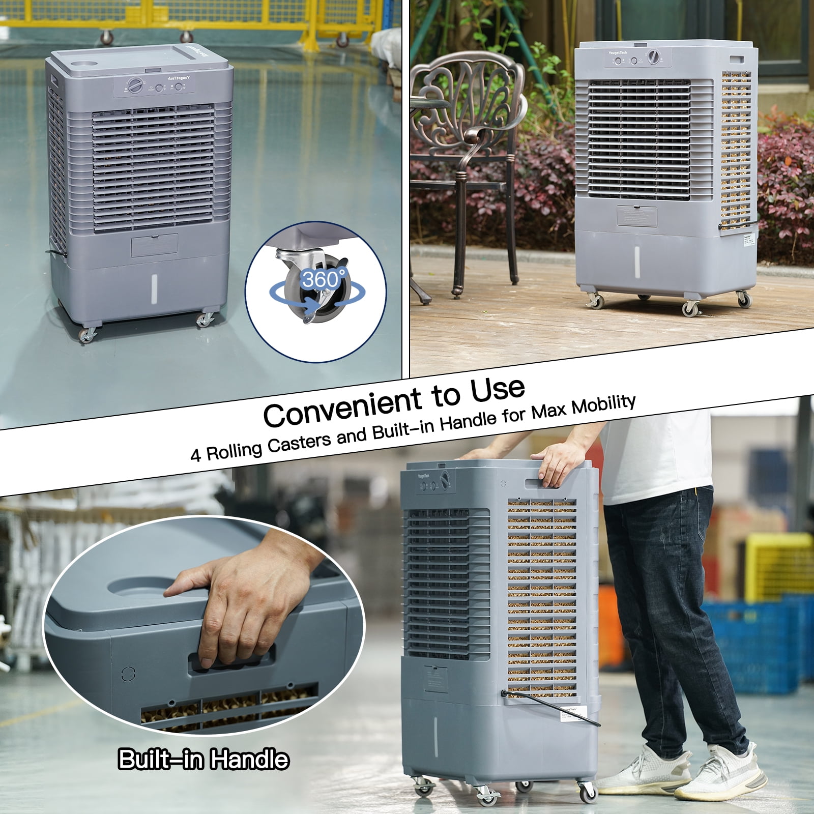 Where and why should we use a Evaporative Air Cooler? In spring, summer, and autumn, mild or hot weather. In a dry environment with low humidity. In an open environment, it cannot be used in a confined space. Energy Efficiency: It uses less energy compared to air conditioning units, as it does not require refrigerants. Cooler Air: The evaporated water helps to cool the air before it circulates throughout the space. Lower Maintenance Costs: Compared to AC devices, this type of ice cooler fan requires less maintenance. 【LARGE COVERAGE AREA, 3000CFM AIR VOLUME】 It’s a 3-in-1 Portable Air Coolers that blows, humidifies, and cools air in outdoor open spaces. With its 90 ° horizontal oscillation and 90 ° vertical oscillation, the Cooler fans can expel 3000 cubic feet of cold air per minute and distribute it to up to 720 square feet space. 【30L/8GAL LARGE TANK & AUTOMATIC REFILLING】 Featuring a large 8-gallon water tank that can keep the cooler working for 5-8 hours. The water level indicator helps you monitor the water usage. You can manually add water from the water inlet or connect the garden hose to refill automatically, with multiple options. 【4 ROLLING CASTERS for MAX MOBILITY】 YougetTech Evaporative Air Cooler features 4 heavy-duty 360-degree wheels (2 with brakes,2 without brakes). The universal wheel, dust proof bag, copper interface, and other parts are placed in the top tool box. There are handles on both sides of the cooler, you can move it to any space. 【ENERGY-SAVING & ECO-FRIENDLY COOLING】The evaporative air cooler has neither a compressor nor refrigerant, which is energy-saving and environmentally friendly, with a rated power of only 160W. The three-sided 3D honeycomb cooling pad offers enhanced cooling performance compared to other Cellulose pads, is more absorbent and permeable. 【EASY to OPERATE】The built-in mechanical control only have three buttons: speed (High, Med, Low), pump (On, Off) and oscillation(On, Off). It’s easy to operate. This Air cooler offers you the most reliable performance. YougetTech EC3822 Evaporative Air Cooler What is an Evaporative Air Cooler? Evaporative Air Cooler is a product without compressor and without cooling coal. It utilizes the principle of evaporative cooling with fresh outdoor air to cool down and achieve ventilation and cooling through convective air exchange. Air supply, cooling, humidification and other functions are all in one, blowing out humid and cold air below room temperature. Precautions when using? It DOES NOT use refrigerants to remove heat & humidity like an air conditioner. Not effective in high humidity areas.