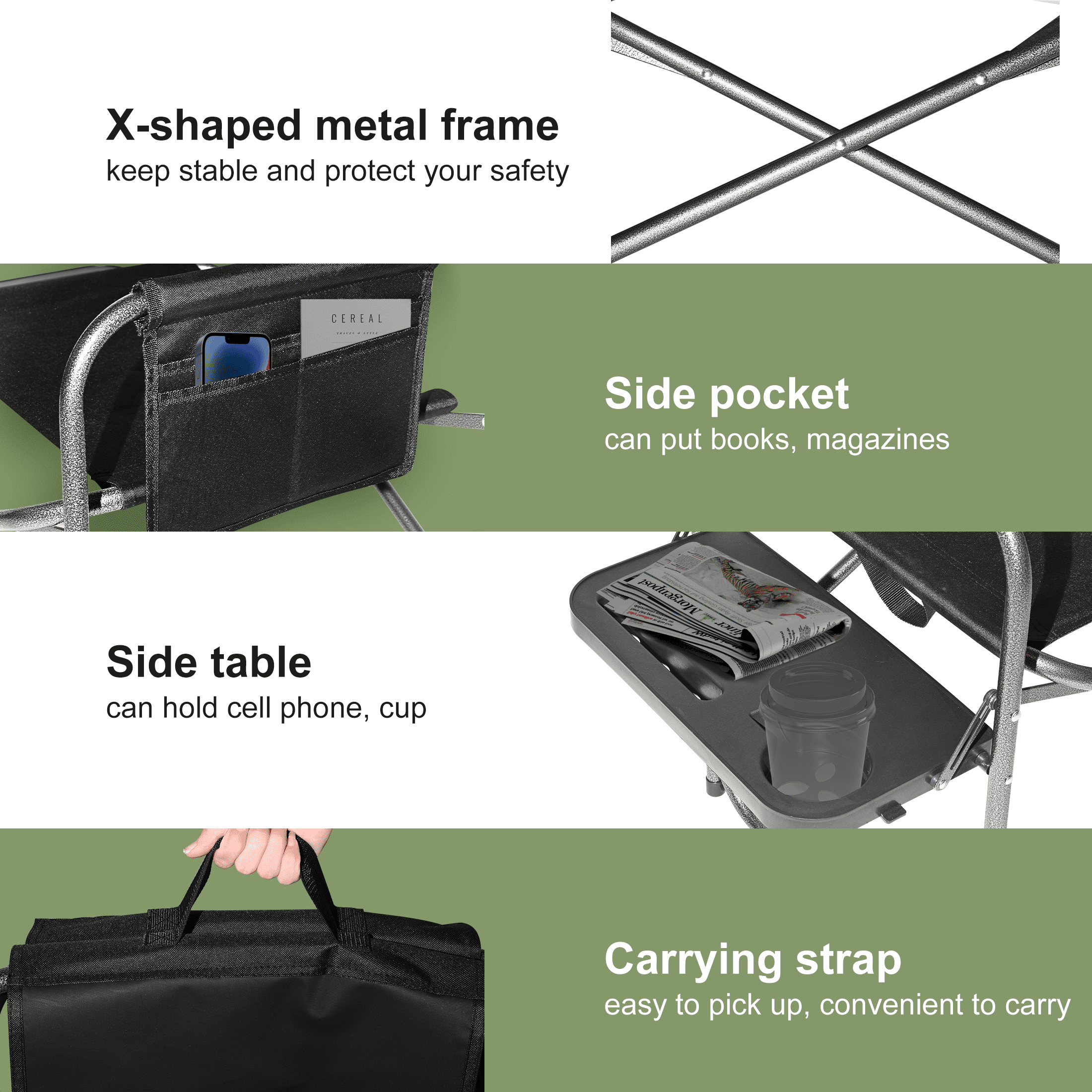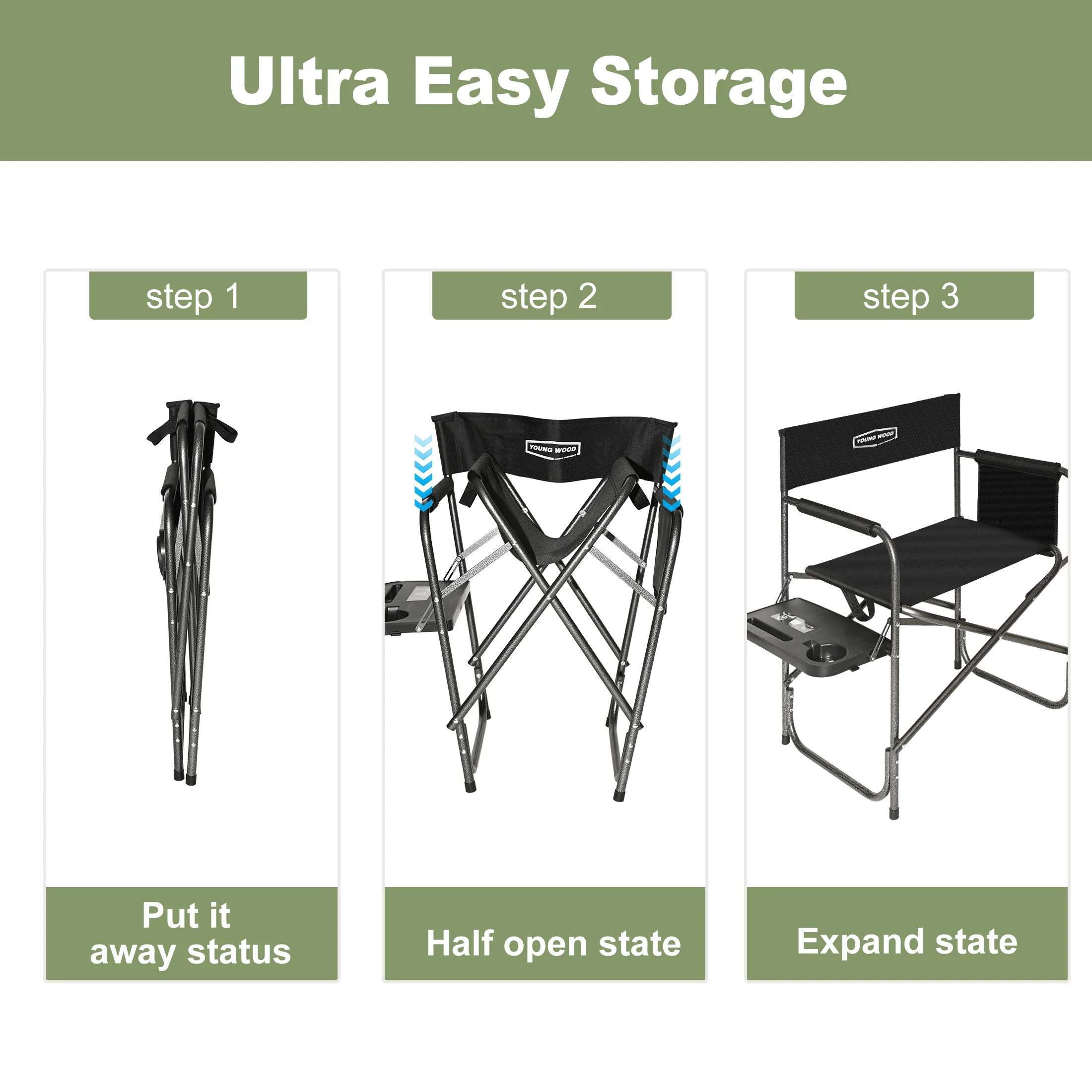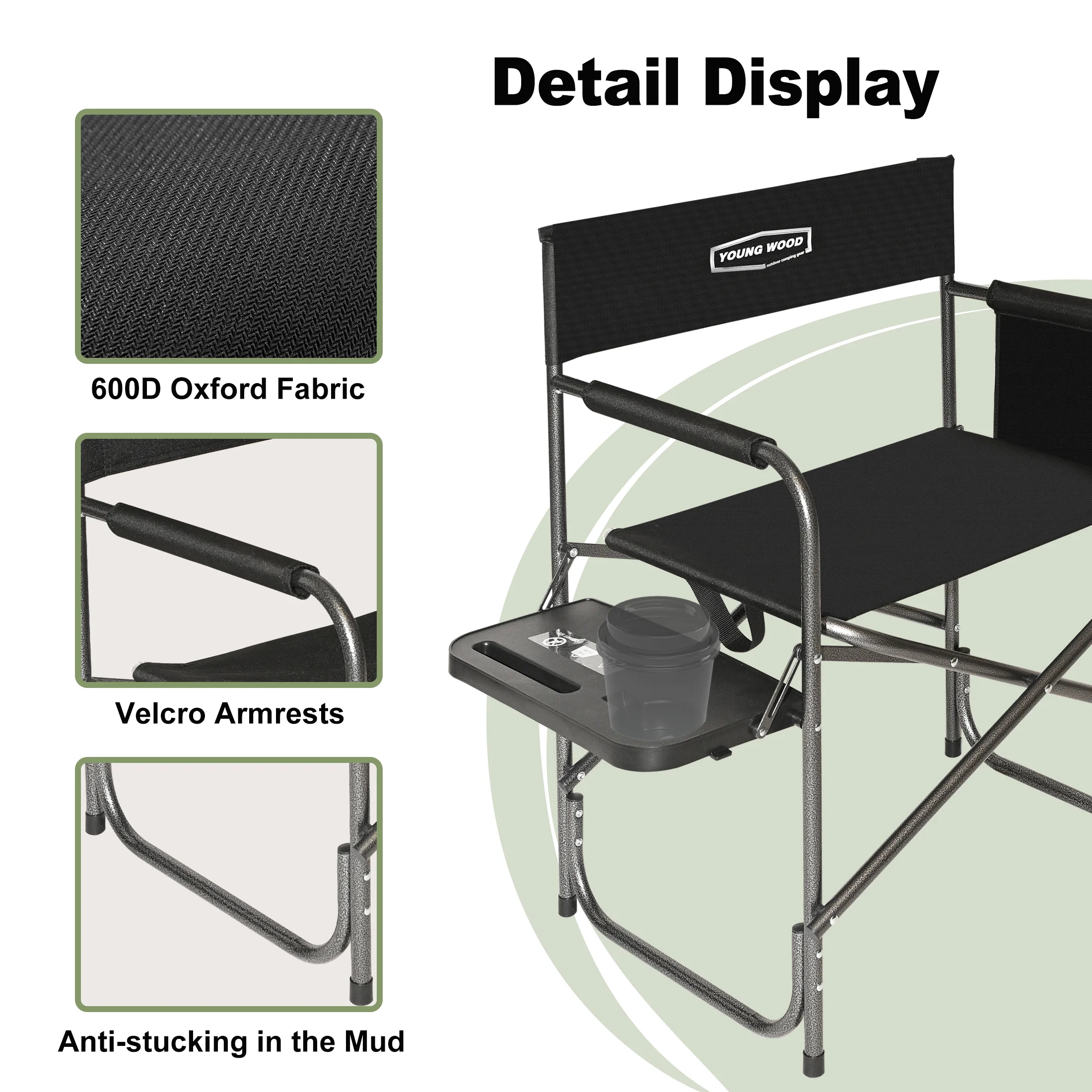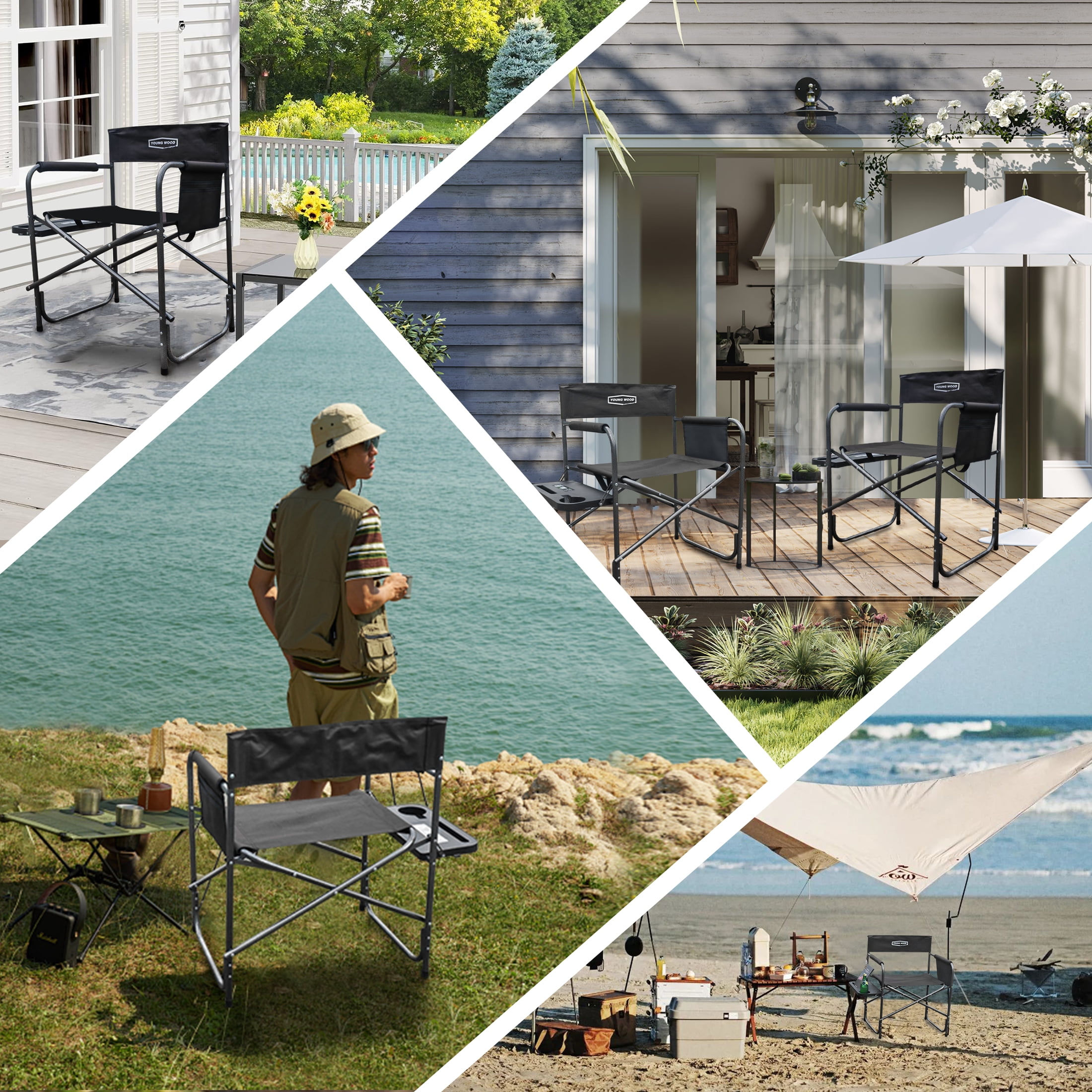 Whether it is daily leisure or related industry needs, the director’s chair will be an ideal assistant. Comfort with portable convenience for all your outdoor events and camping needs. Including a side table with a built-in beverage holder to keep snacks and drinks handy.