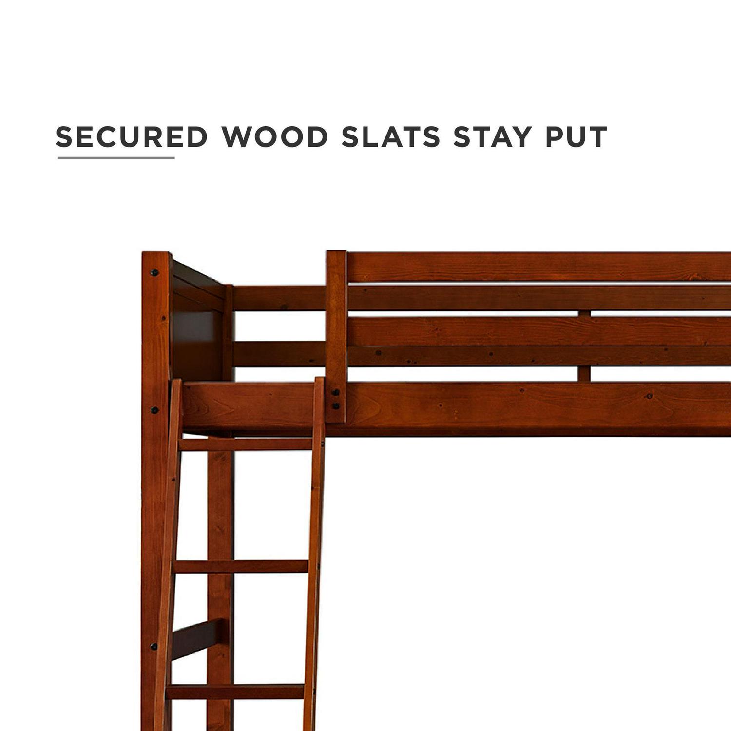 – Traditional loft bed frame for kids. Features a sturdy wood construction, a ladder, full-length guardrails and a panel design on both the headboard and footboard.