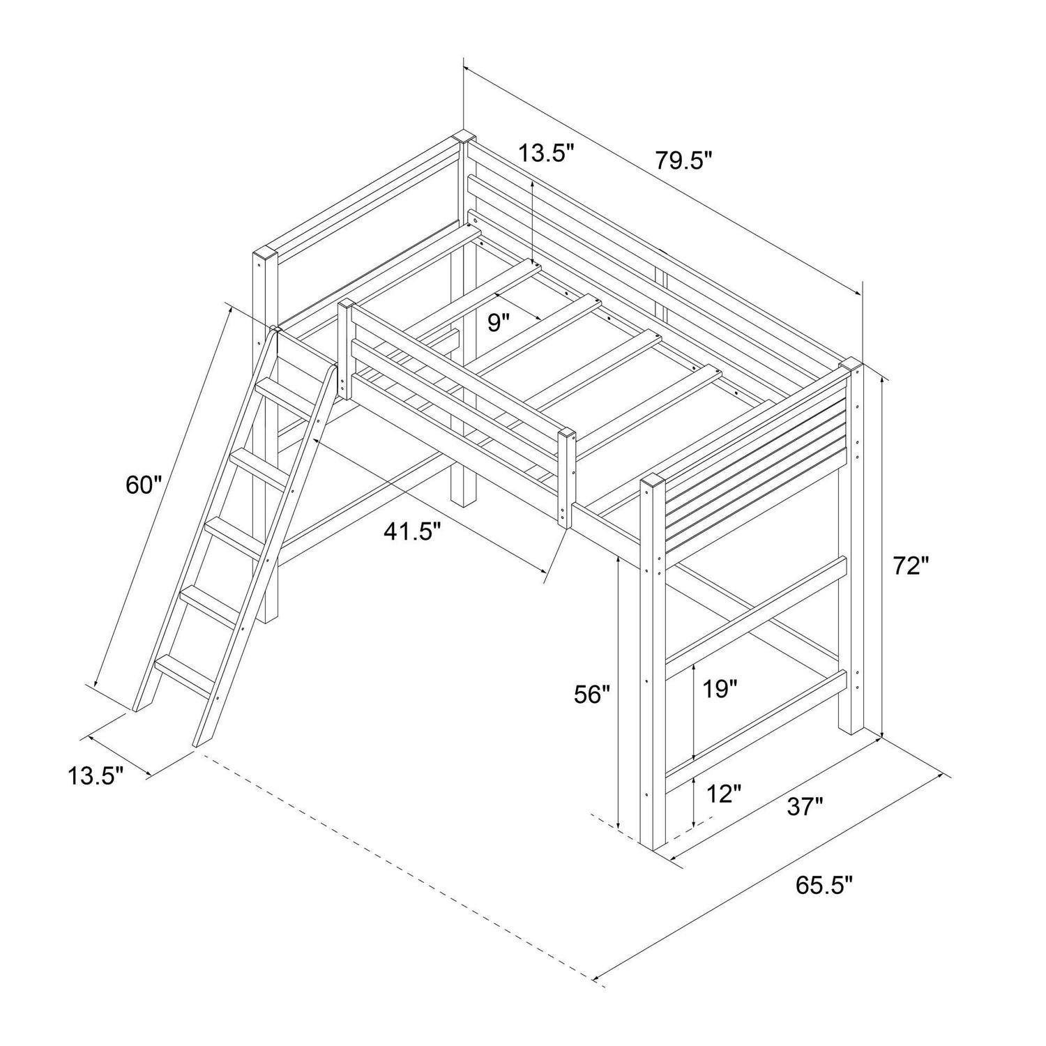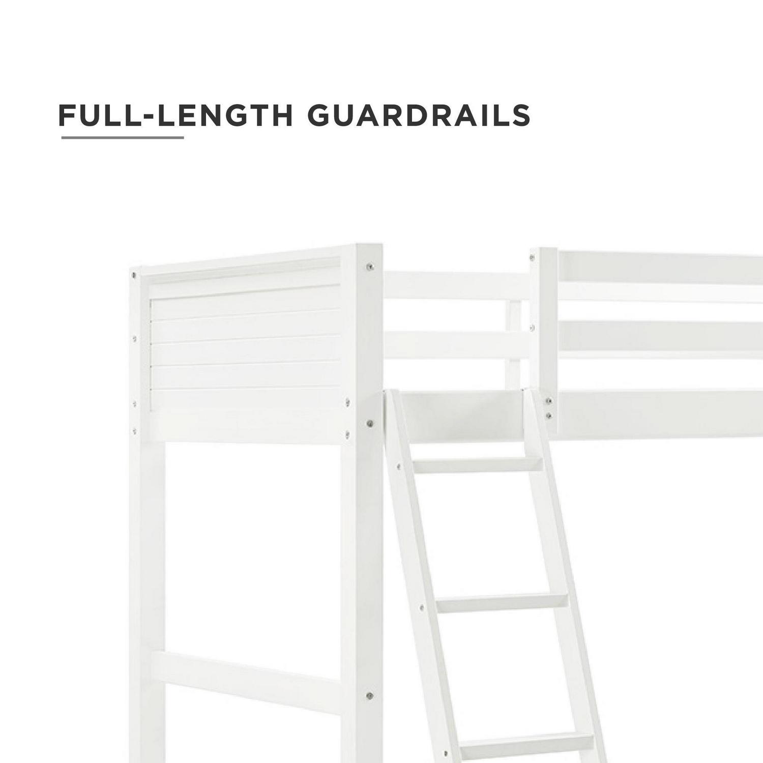– Traditional loft bed frame for kids. Features a sturdy wood construction, a ladder, full-length guardrails and a panel design on both the headboard and footboard.
