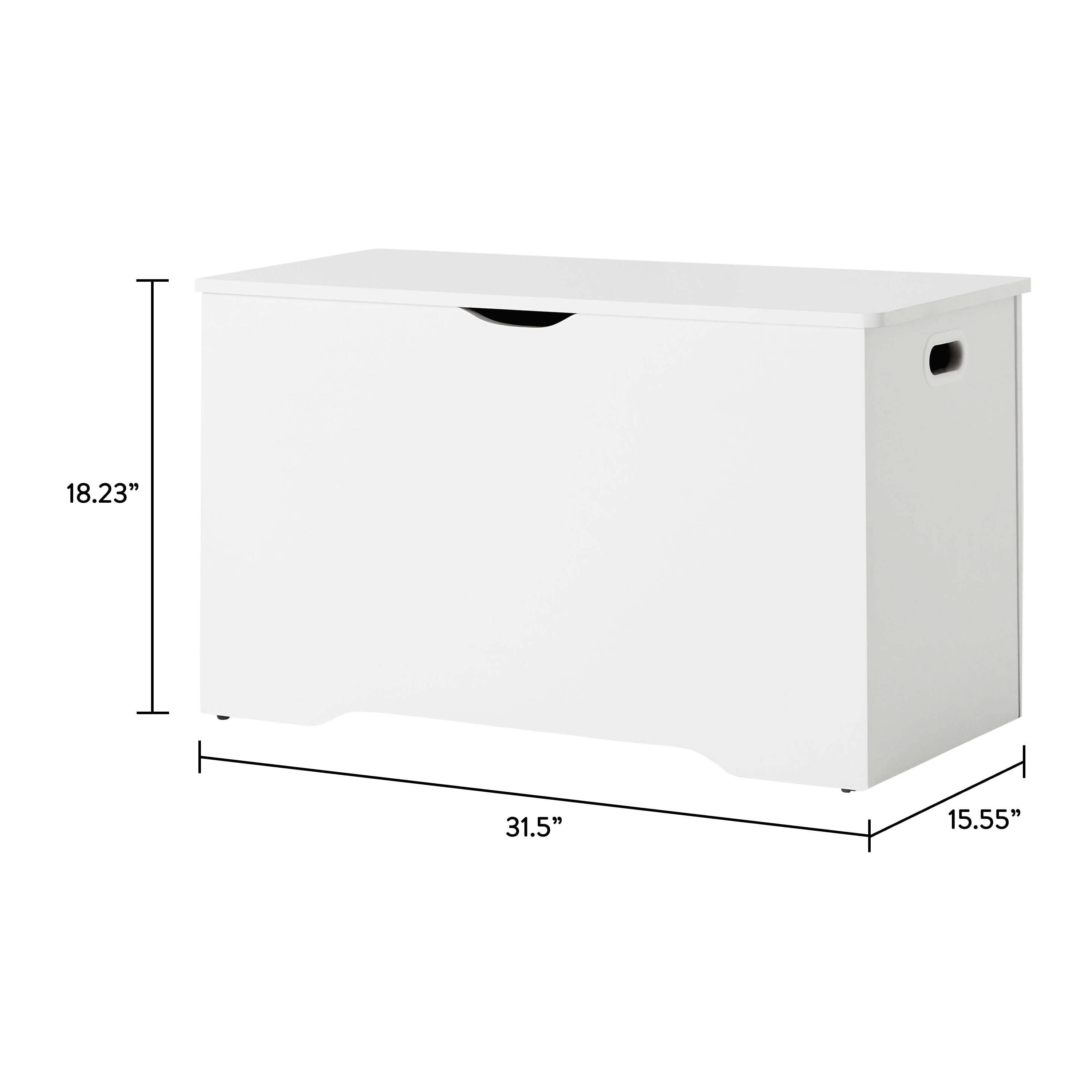 Spacious lift-top toy box with a sleek white finish Slow close safety hinged lid ensures that the top closes slowly, smoothly and quietly Features cutout handles on both sides with plastic inserts for smooth edges Assembled dimensions: 31.5″ W x 15.55″ D x 18.23″ H Assembled weight: 36.08 lbs Interior storage size: 29″ W x 14″ D x 15.75″ H Materials: manufactured wood Maximum top load: 66 lbs Adult assembly required (flat head screwdriver and phillips head screwdriver required) Package size: 20.2″ x 35.43″x 4.45″ (40.48 lbs) Assembly Instructions Assembly Video