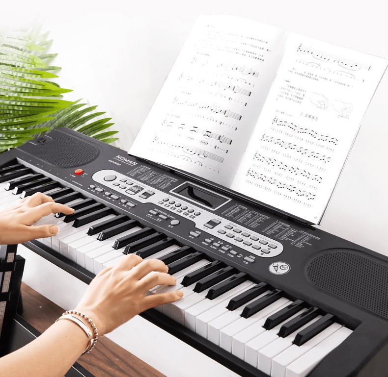 Professionally designed in standard 61-key keyboard shape with compact construction and 61 well-tuned keys. This keyboard would produce nice sound effects and offer you great playing experience. Contains a durable music stand for placing music books, making playing keyboard convenient.