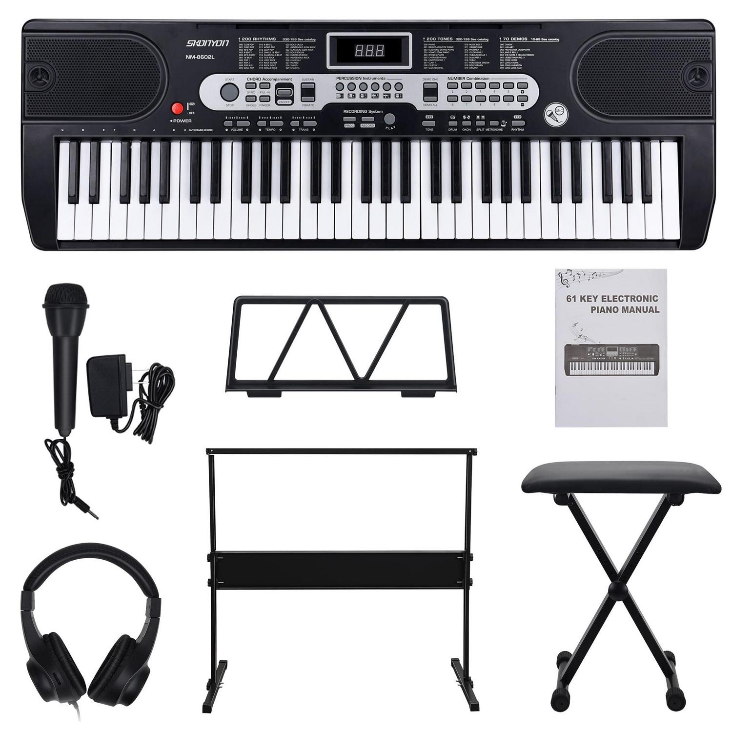– Package Includes: 1 x 61-Key Piano Keys Keyboard, 1 x Music Stand, 1 x Headphone, 1 x Keyboard Stand, 1 x Bench, 1 x DC 12V/AC Adaptor, 1 x User Manual
