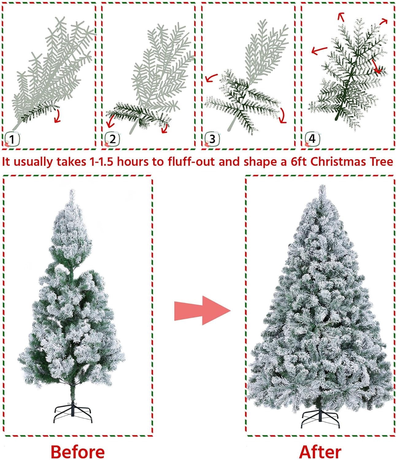 Snowy Elegance: Embrace the festive spirit with our snow-flocked Christmas tree, the key to a season filled with holiday cheer. This tree boasts sturdy branches, capable of showcasing garlands and your cherished ornaments for a truly personalized touch. Full and Natural Beauty: Achieve the look of a real pine tree effortlessly. With 1,000 branch tips, our tree can be fully fluffed, resulting in a healthy and natural appearance that captures the charm of a genuine pine tree. Effortless Setup and Storage: Make holiday preparations a breeze with our Christmas tree. Convenient hinged branches simplify both assembly and disassembly. Limbs hinge around the center pole, falling into place during setup and folding neatly for storage. For a 6ft tree, you’ll have it fully fluffed in just 30-45 minutes. Quality That Delights: Dive into the holiday joy with our carefully crafted artificial tree. Premium PVC branches and tips ensure durability, while the iron trunk and stand offer a sturdy and balanced foundation for your seasonal celebrations. Endless Decorating Possibilities: Unleash your creativity and transform your living space, office, or holiday party with ease. Customize your tree with garlands, lights, ornaments, and more! The overall dimensions, including the stand, are 31″(Dia) x 72″(H).