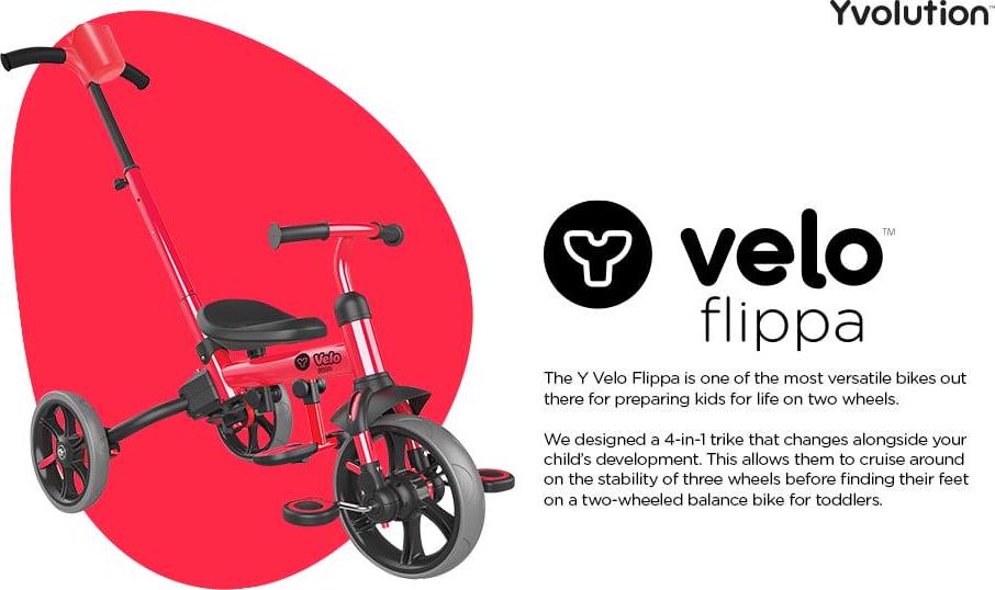 Y Velo Flippa – The Y Velo Flippa keeps up with your child! We designed a 4 in 1 bike that changes alongside your child s development. This allows them to cruise around on the stability of three wheels before finding their feet on a two wheeled balance bike. So, they now have the chance to learn the basic skills they need to ride a bicycle before switching to two wheels and mastering the art of balance. By practicing in stages, they can learn much quicker and will be ready for pedal bikes in no time! 4-in-1 Toddler tricycle to Balance Bike. Simply twist and flip to transform this mega trike into a two wheeled balance bike in seconds! Kids trike, unisex in red.