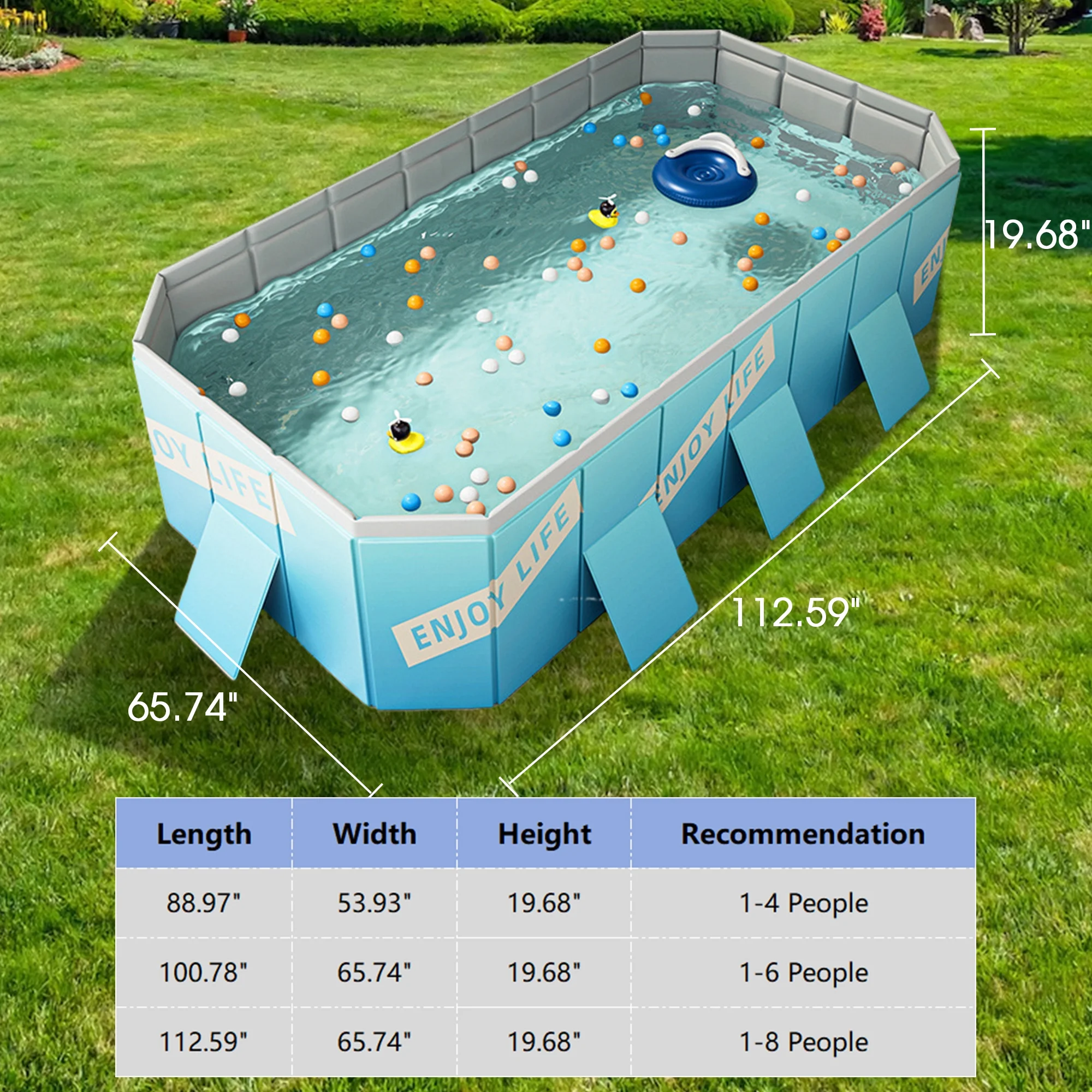 Durable & Sturdy Rectangular collapsible swimming pool clearance is made of 4 layers of material with a hard plastic shell and high quality PVC surface for durability. There are also 8 triangular brackets around the hard kiddie pool to provide strong support and anchoring. Multifunctional Pool The plastic pool for kids hard is designed for boys, girls, adults or families. Hard pool can also be used as a dog pool. Family pool clearance can be placed in the backyard, garden, outdoor or indoor, providing plenty of space for family fun and relaxation. Easy to Assemble, Foldable for Storage: Excellent inflation-free folding design, no tools required, just fully unfold the pool and pull out the triangular support legs on all sides, get ready for hot summer fun in minutes! The foldable design is easy to store and carry around without deflating and disassembly! Fast Draining & Easy Cleaning The clearance pool has 2 drain outlets on the bottom and side, which speeds up the drainage and does not leave a lot of water in the rectangular swimming pools for backyard, avoiding the mess and saving time and energy. Refreshing Summer Fun: Our extra large foldable pool accommodates children and adults, providing plenty of room for family fun and relaxation. Ideal for summer pool parties or relaxing on a hot summer’s day, portable pool is suitable for a variety of activities such as a sand pool, ball pool or water play. This folding pool will create a refreshing oasis in your backyard. Brand: YYW Color: Sky Blue Shape: Rectangular Material: Polyvinyl Chloride (PVC) Assembly Required : NO Special Feature: Portable, Foldable, Non-Inflatable, Above Ground Target Audience: Unisex-Kids, Unisex-Adults Small Size: 88.97″L x 53.93″W x 19.68″H for 1-4 People Medium Size: 100.78″L x 65.74″W x 19.68″H for 1-6 people Large Size: 112.59″L x 65.74″W x 19.68″H for 1-8 people