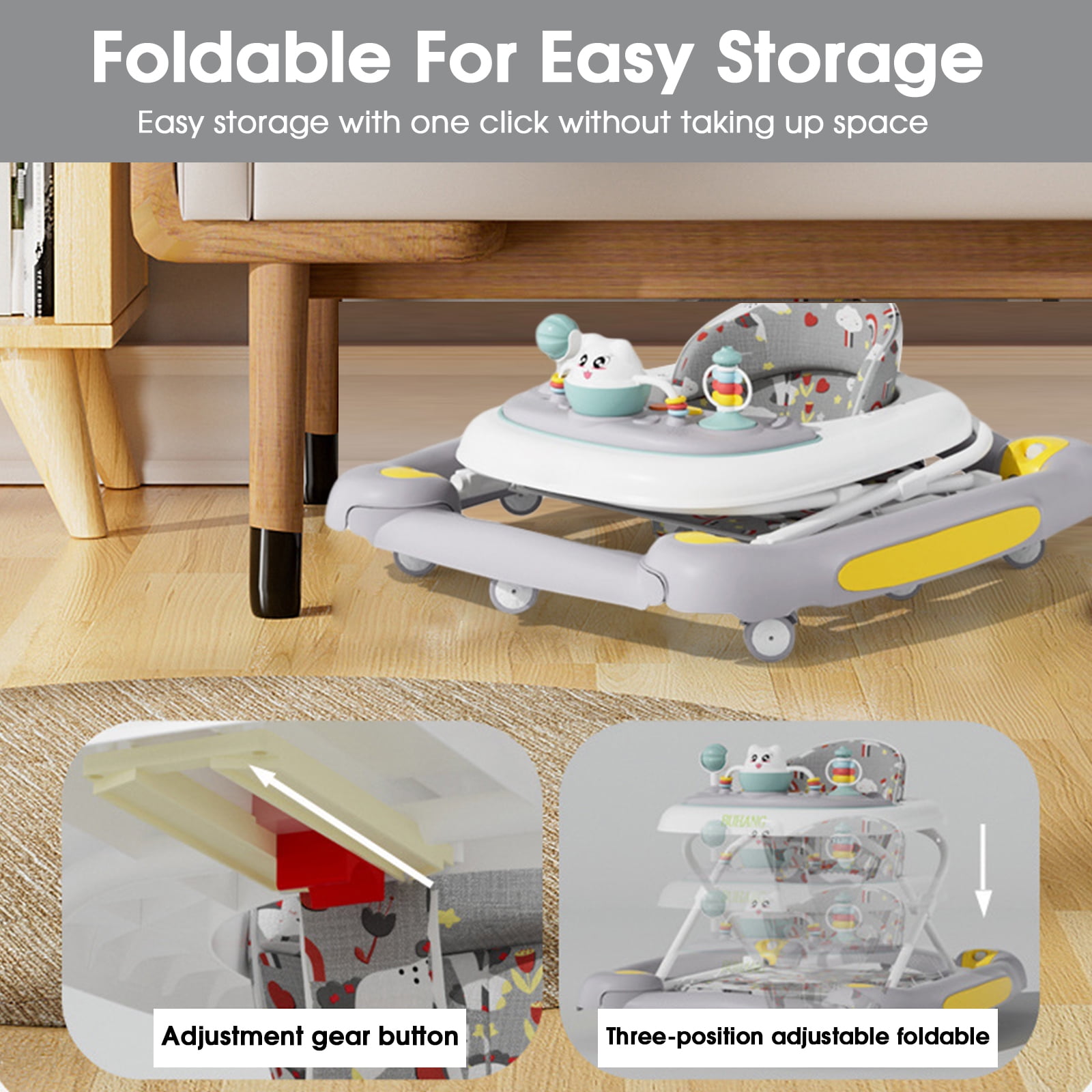 The baby walker has a six-in-one multi-functional design, not only can be used as a walker for babies to learn to walk, but also can be transformed into a rocking horse to bring more joy to babies. The baby walker is made of environmentally friendly materials, ensuring that the items baby comes into contact with are safe and harmless, promoting healthy growth. The cleverly designed foldable structure makes it easy to store and carry, taking up minimal space, suitable for home and travel use. The baby walker has undergone rigorous testing and certification to ensure safety and reliability, giving parents peace of mind. The safety belt design and stable chassis provide solid support, preventing children from falling or getting hurt, ensuring the baby enjoys comprehensive protection during the learning-to-walk process.