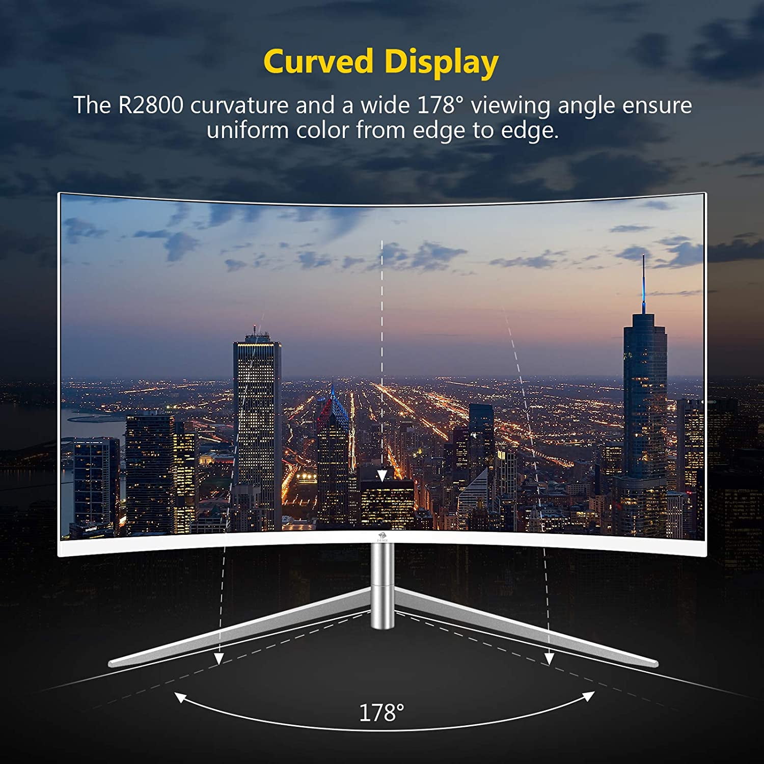 24-inch Curved Monitor Wrapping around your vision like the theater screen, this 24 inch curved monitor covers a wider field of the view, enhances the depth of the perception. The monitor offers you the maximum immersion whether you watch the movies or play casual games, the monitor will fully engage you in all your content. FHD 1080P Resolution With 1920×1080 resolution, this curved monitor delivers you with the vivid and stunning images, presenting videos or pictures with more details. Advanced VA Panel Thanks to the high-end VA panel, the monitor enlarges the viewing angle to a greater extend, providing the 178°panoramic viewing angel. The 3000:1 contrast ratio provides richer colors, allowing you to capture more image details. 75Hz Refresh Rate and 5ms Response Time The 75Hz refresh rate provides smooth video, good choice for watching videos, catching up on favorite TV drama and casual gaming. 5ms response time helps prevent streaking, blurring and ghosting, during intense action scenes in video games and movies. Three-sided Ultra-slim Bezels Design Ultra-slim bezels design makes full use of the screen, brings the modern and sleek look to this streamlined monitor. Eye-Care Tech Flicker-free and low blue light technology minimizes blue light to protect your eyes from strained after the prolonged use of the monitor. Multiple Ports Support The monitor has not only the traditional VGA port, but also an additional HDMI port, ensuring that you can easily connect the monitor to a TV or other devices. Built-in Speakers Built-in two speakers, the monitor affords the surrounded sound, you can connect your own speaker or the headphones via the 3.5 mm audio jack. Note 1. VGA port does not support audio transmission; 2. Support VESA mount 75*75mm, additional spacers are required(Not included)