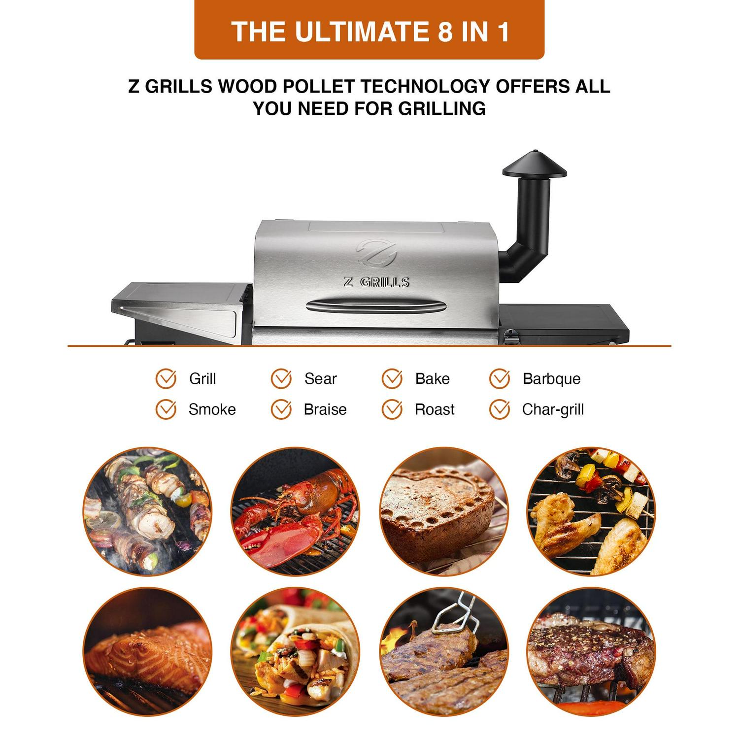 - Ultimate 8-in-1 barbecue wood fire pellet grill: BBQ, bake, roast, braise, smoke, grill, sear, char-broil