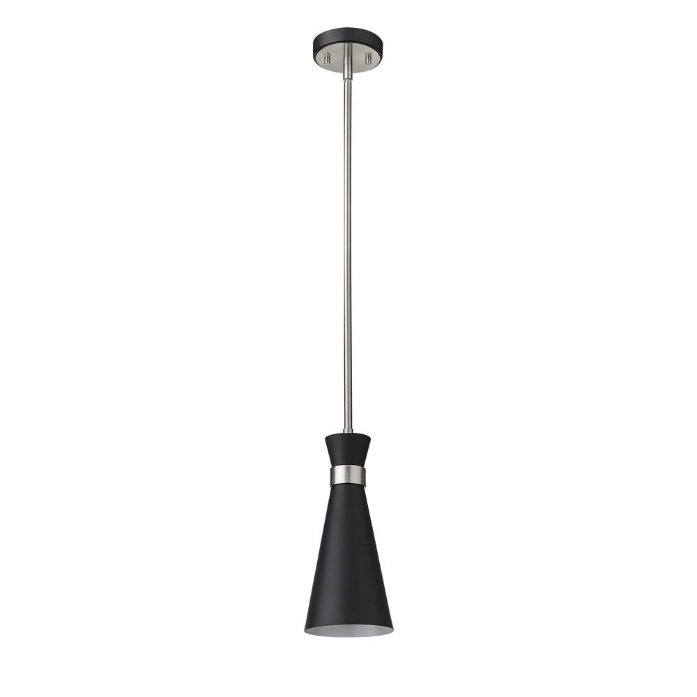 A decorative silhouette shapes industrial influence that adds casual elegance to this matte black finish metal mini-pendant. Dress up a compact space or nook with this tasteful fixture trimmed with brushed nickel finish steel. This sleek mini-pendant captures the heart of romantic industrial charm. Features : Frame Finish: Matte Black and Brushed Nickel Frame Material: Steel Shade Finish: Matte Black Shade Material: Metal Style: Modern, Billiard, Retro, Period Inspired Room of Use: Bedroom, Dining Room, Dinette, Kitchen, Kitchenette Dimmable: Yes Energy Saver: No UL Classification: CUL/ cETLu UL Application: Dry Specifications : Product Dimensions : 13″ H x 5.5″ W x 5.5″ D Product Weight : 2 lbs Product Dimensions : (Chain Length Rods) 6 x 12″, 1 x 6″, 1 x 3″ Product Dimensions : (Cord Length) 110″ Wattage : (Bulb) 60W Bulb Type : Medium Number of Lights : 1