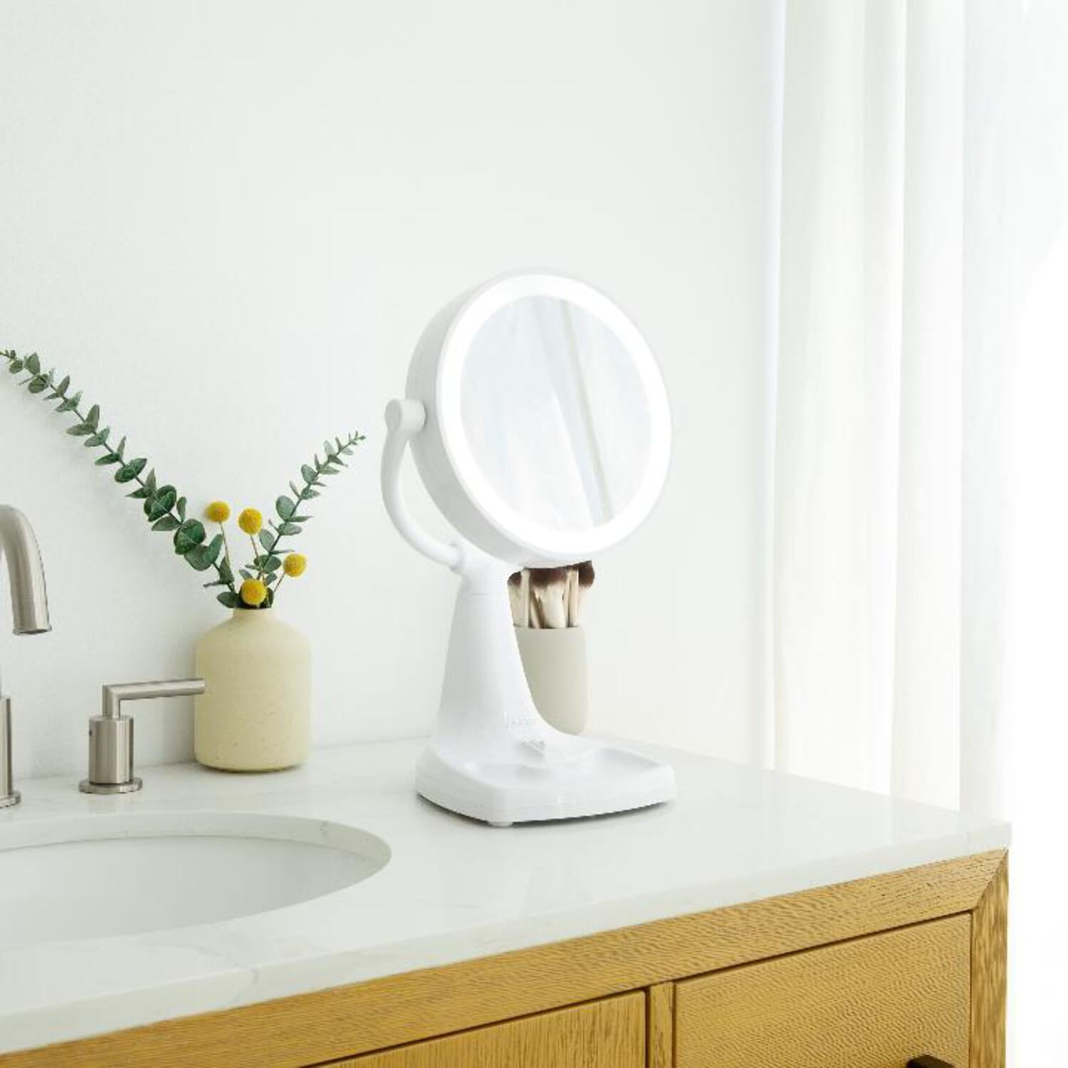10x/1x dual-sided vanity mirror with fluorescent lighting that emulates natural sunlight 11 x 8 x 17.5-Inches outer product dimensions (9 inch mirror head size) 6-Foot cord with built-in cord storage in base ; Power Source: Corded – Electric