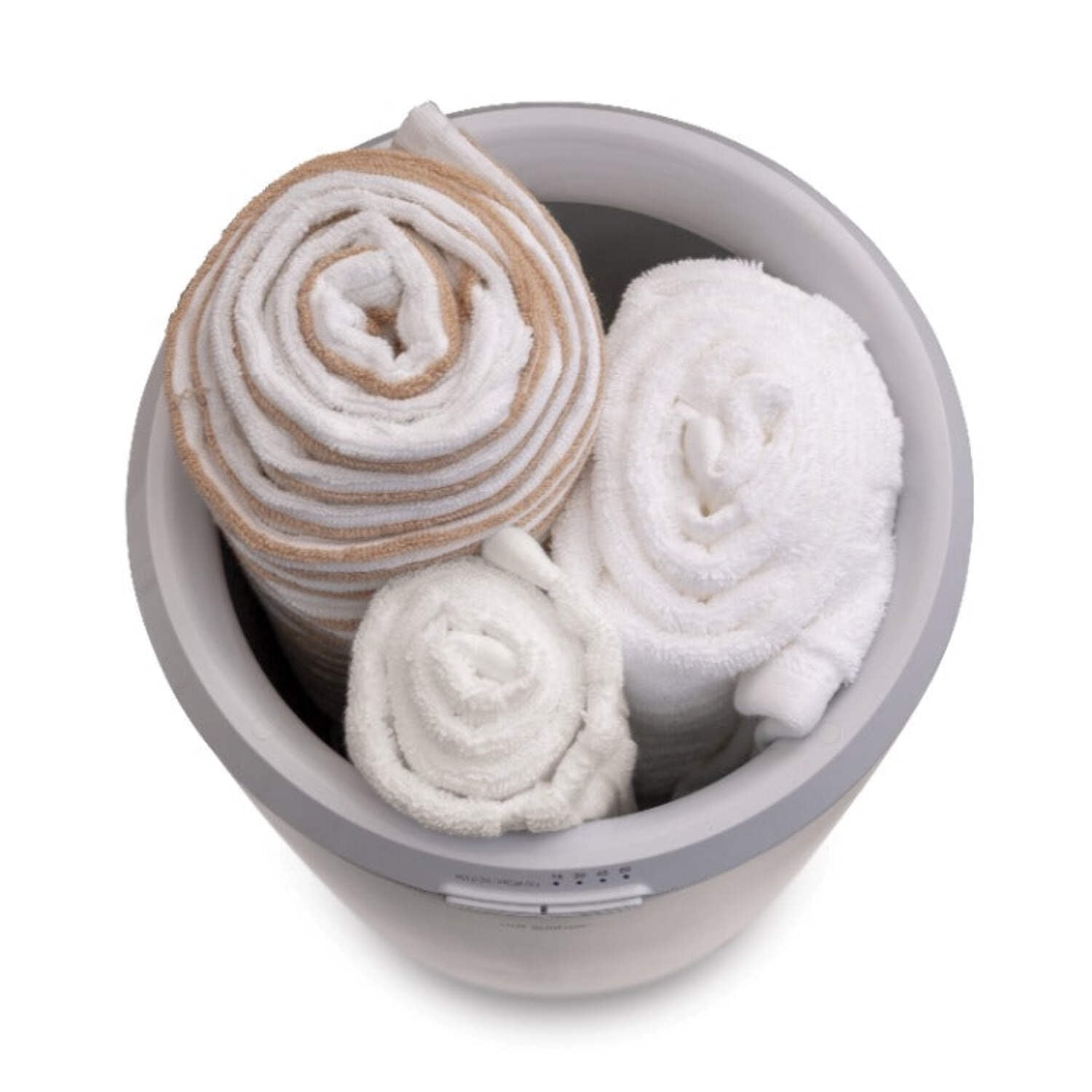 ULTRA LARGE CAPACITY: The ultra-large insulated plastic bucket design accommodates up to two 40’’ x 70’’ oversized bath towels, robes, throw blanket, PJ’s and more 4 TIMER SETTINGS: Always have warm towels ready by using the built-in timer to heat your towels for 15, 30, 45 or 60 minutes before automatically shutting off BUCKET DESIGN: No more cold spots; evenly heats the entire towel inside and out
