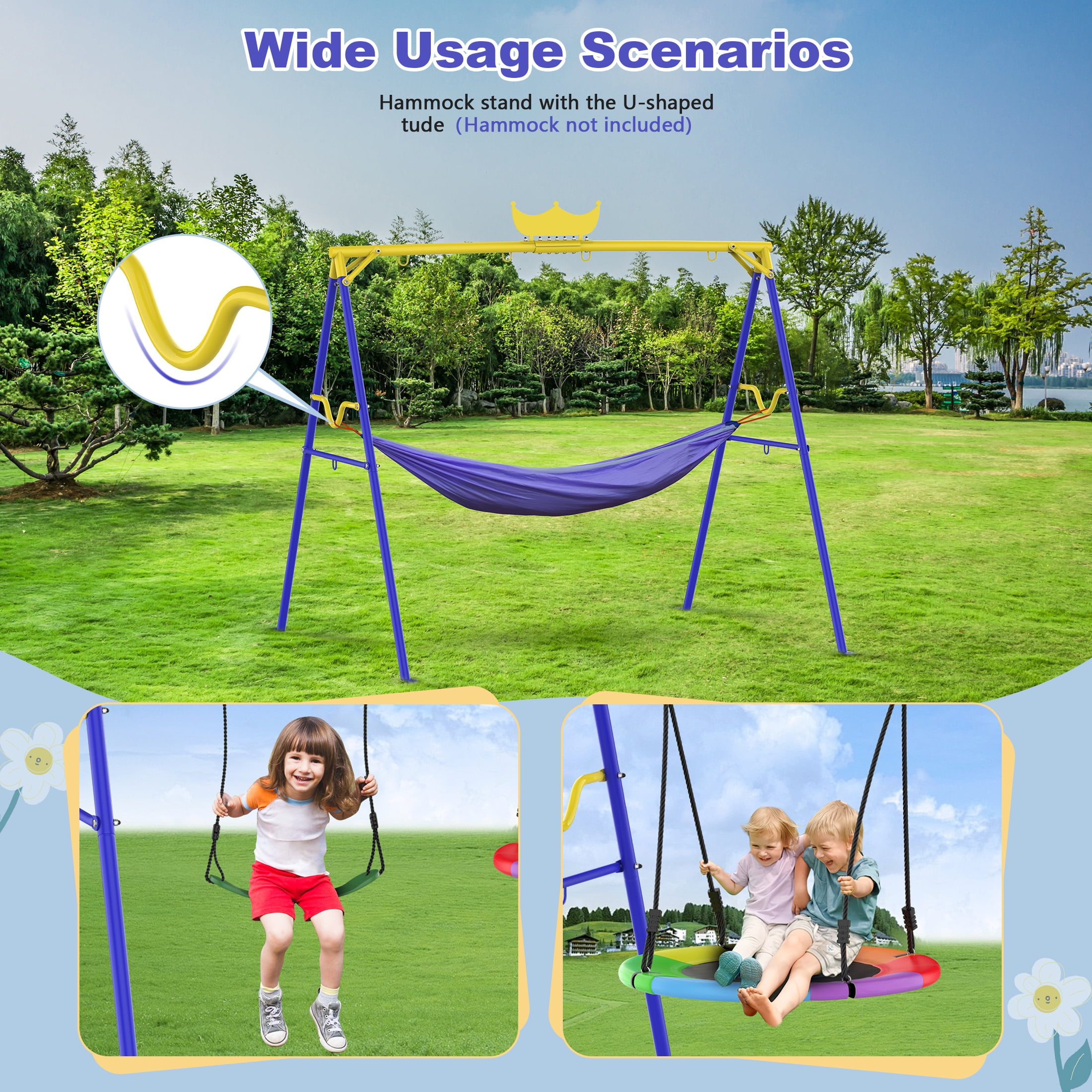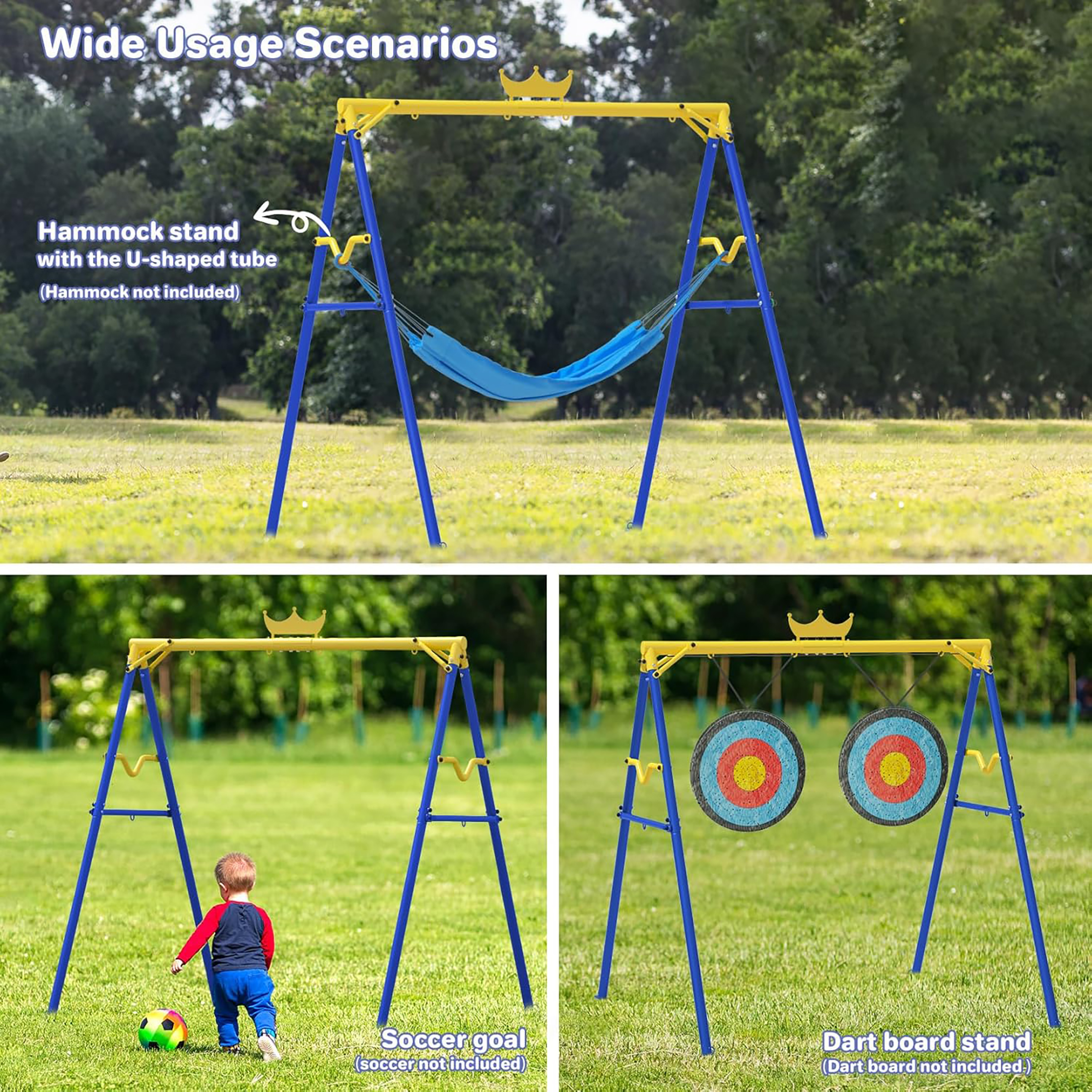 Zifadola Sport heavy-duty backyard swing set comes with two swing seats, Saucer Swing Seat and Belt Swing Seat. Premium powder-coated steel and recyclable PE swing bracket seats make it anti-rust, anti-fade or discoloration with reduced heat retention. PVC-coated iron chains prevent snags or pinches. Using a carabiner system, the swing seats are easily adjustable to different heights, so kids can continue playing on the Zifadola Swing Set as they grow! Up to 2 kids can swing together on the flying glider for double the fun. The U-shaped hooks on the left and right sides of the swing can also be used to hang the hammock(Hammocks not included), and the U-shaped hooks can stabilize the position of the hammock so that it will not slide freely, the swing can bear 440lbs, enjoy a comfortable life together! The fun never ends with the Metal Swing Set by Zifadola! All Zifadola products meet or exceed all ASTM safety standards, so kids and parents can both enjoy the Zifadola Metal Swing Set with peace of mind.