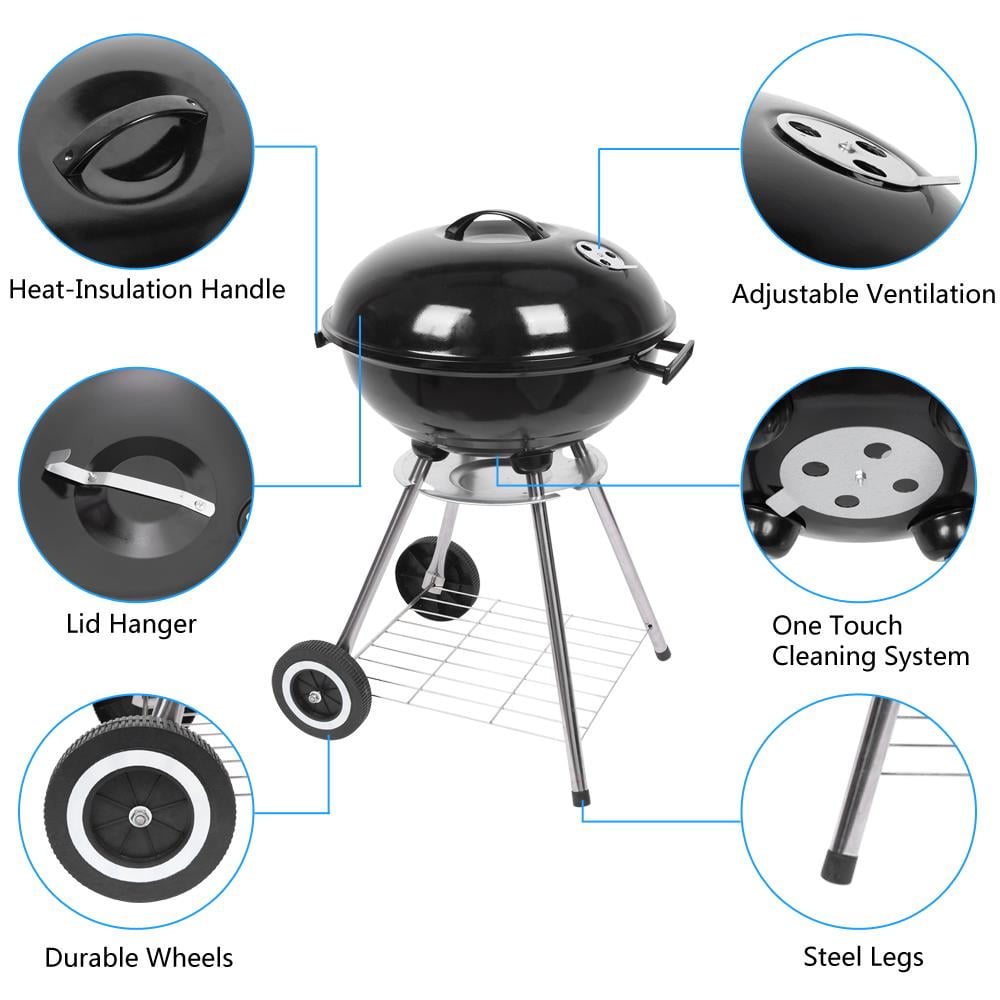 Feature: [QUALITY] Made of quality galvanized steel, no rust, no corrosion, fine workmanship and durable [EASY TO USE & CLEAN] The ash leak under the bowl and the ash catcher become the choice to be one-touch cleaning system. You just need to rotate the ash leak to move the ash down into the ash catcher for easy ash disposal and cleaning. The durable wheels make this charcoal BBQ grill to be easy to move and transport for outdoor picnic tailgate camping. [PORTABLE CHARCOAL GRILL] This product uses a spherical design, multi-function oven, because of its small footprint, it can save space, so it can be easily carried anywhere and enjoy cooking. [PERFECT HEAT CONTROL & RETENTION] Air vents of charcoal barbecue grills lid adjusts for maximum heat control. [EASY TO ASSEMBLE & PERFECT GRILLING] This portable charcoal barbecue grill is easy to assemble with step by step instruction. The thick grilling bowl and lid with porcelain-enameled coating provides precise heat retention for grilling tastier food. Just adjust the air vent damper to any grilling condition you’d like. You will love superior smoky flavor and then enjoy your wonderful meal of filet mignon, burgers, steaks, chickens, chop, turkey, summer squash, onion, asparagus, and shrimp. Specification: – Size: 18-Inch Charcoal Grill – Material: Steel – Fuel Type: Charcoal – Cooking Height: 60cm / 23.6 Inches – Firebowl Size: Dia 46.5cm / 18.3 Inches – Lid Size: Dia 47cm / 18.5 Inches – Cooking Grid: Dia 44cm / 17.3 Inches – Thickness Of Material: 0.4mm Package Includes: 1 x 18-Inch Charcoal Grill 1 x User Manual Notice: Do not move the barbecue grill while it is being heated or in use This product is not intended for use by children alone, be extremely cautious when using this product near your child