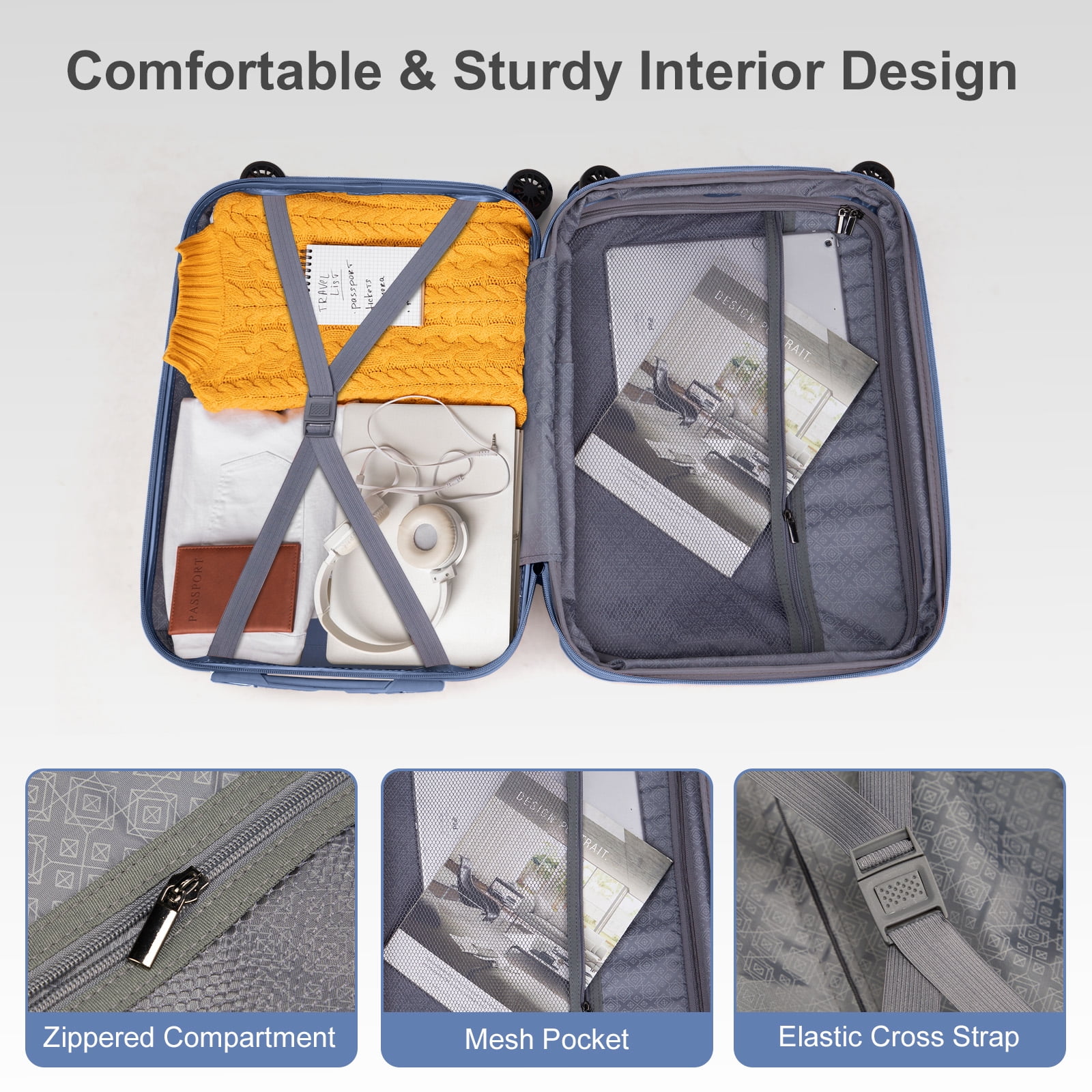 Zimtown, we are committed to creating lightweight, durable, and stylish high-quality luggage. Our ABS+PC material luggage sets are specially designed to meet your travel needs, providing ample space for all your belongings while ensuring maximum protection for your valuables. Whether you’re a frequent business traveler or an occasional vacationer, our Zimtown luggage set is the perfect companion for your next trip. With a sleek, modern design, this luggage set is not only highly functional but also stylish, allowing you to travel with confidence and charm. Features: ★Expandable 20 inch Suitcase: Open the smooth and durable expandable zipper, can expand the capacity of the suitcase by 20%. Soft handles on the top and sides of the luggage help you lift the suitcase easily without hurting your fingers. ★TSA Customs Lock: TSA Customs zipper lock, sturdy and reliable, gives you more peace of mind. When going through customs, you don’t have to worry about the box lock being damaged due to brute force detection. ★High Quality Suitcase Set: The suitcase can store daily clothes well, and the large-capacity cosmetic bag can be used to store toiletries, cosmetics, small items and various personal items. ★Wear resistance: Suitcases are made of thick hard shell material, ABS+PC, making them more durable, dirt resistant, and resistant to wear and tear. ★ Package includes: 1 x 20″ carry-on luggage (15.7″ x 7.6″ x 22.2″, 6.17 lbs) and 1 x 14″ (13″ x 11.4″ x 6.7″, 2.2 lbs) cosmetic travel case. 20″ suitcase fits Carry-on size requirements for most US and international airlines. Specifications: 1. Material: ABS+PC 2. Color: Black/Rose Gold/Green/Blue/Gray/Beige 3. Size: 20 inch+14inch 4. Overall Trolley Case Dimensions: (8.66 x 13.38 x 21.65)” (L x W x H) 5. Weight: 7.05 lbs / 3.2 kg 6. Mute Design: Yes 7. Lock Type: TSA Lock & Mechanical Lock Package Includes: 1 x Carry on Lugggae 1 x Cosmetic Storage Case
