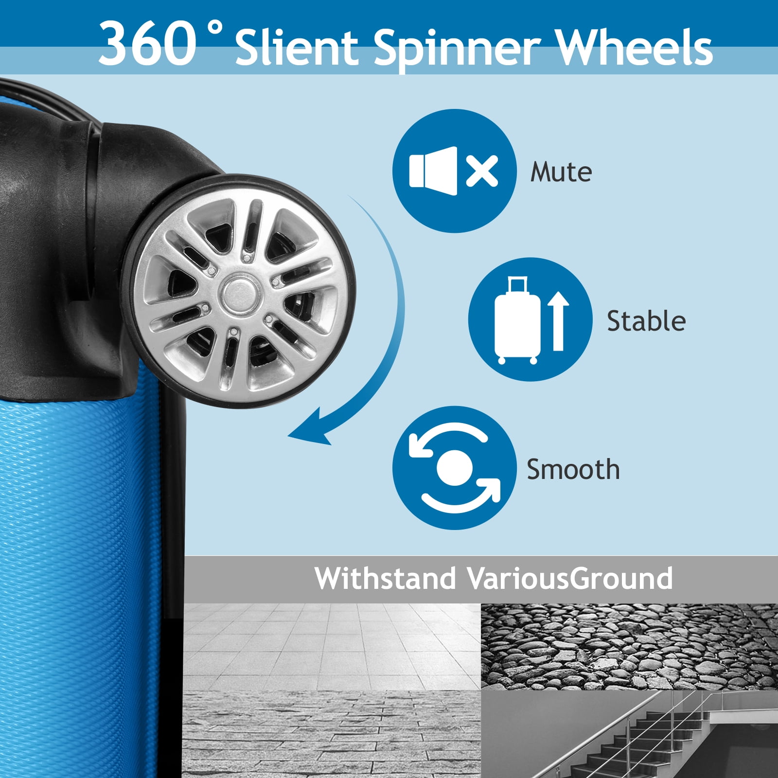 Features: EFFORTLESS HANDLING: (i) Multi-directional 4-wheel spinners allow smooth 360° degree movement on any terrain for complete mobility free-weight rolling (ii) Four molded side feet allow luggage to stand upright on its side (iii) Retractable push-button telescoping handle with two lock positions for ultimate control and maneuverability (iv) Top and side easy grab handles. ORGANIZED COMPARTMENTS: (i) Two spacious fully lined compartments allow for double sided packing (ii) Large interior organizer zipper pocket to store smaller items (iii) Garment restraint straps help hold clothes and contents in place. LIGHTWEIGHT & DURABLE: (i) 20″: 5.29 lbs / 24″: 6.83 lbs / 28″: 8.16 lbs (ii) Durable, lightweight, and water-resistant hardshell (iii) Easily cleaned. (iv) Molded corner guard reinforcements absorb/deflect shock for maximum impact resistance and lightweight construction helps you adhere to airline weight restrictions to avoid unneeded airport fees. PRODUCT SPECS: (20″ Carry-On Dimensions: 21.65”H x 13.78”W x 8.66”D) (24″ Overall Dimensions: 25.59” H x 15.75” W x 10.24” D) (28″ Overall Dimensions: 29.53” H x 18.9” W x 11.02” D). Set Weight: 23.52 lbs. Specifications: 1. Material: ABS 2. Color: Smokey Purple/Sage Green/Champagne/Royal Blue 3. Weight: 317.47oz / 9000g 4. 20″: (8.66 x 13.78 x 21.65)” / (22 x 35 x 55)cm (L x W x H), 5.29 lb / 2.4kg 24″: (10.24 x 15.75 x 25.59)” / (26 x 40 x 65)cm (L x W x H), 6.83 lb / 3.1kg 28″: (11.02 x 18.9 x 29.53)” / (28 x 48 x 75)cm (L x W x H), 8.16 lb / 3.7kg Package Includes: 3 x Luggages