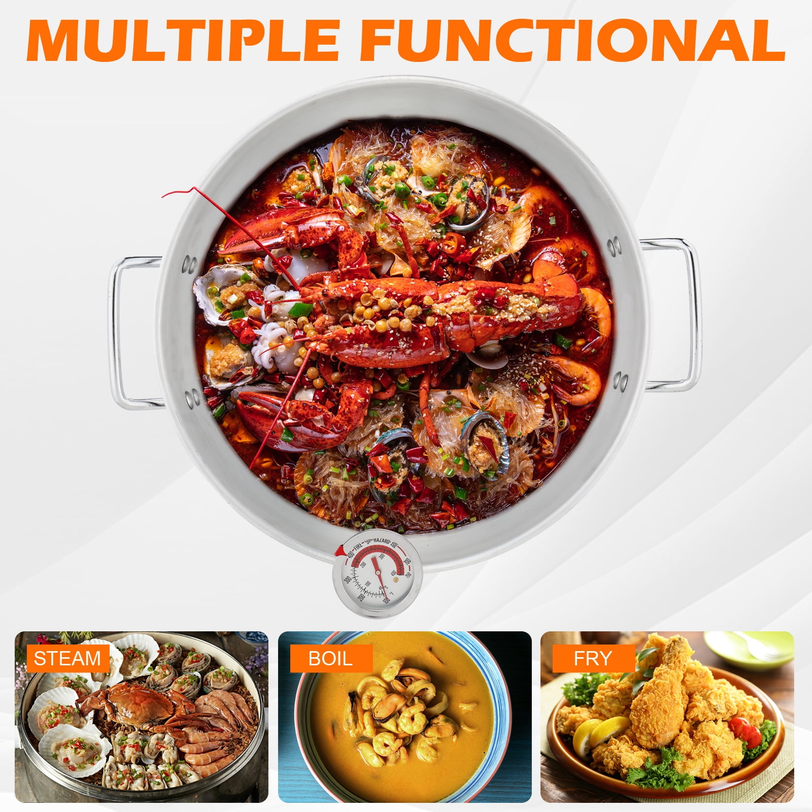 Introductions: Made of aluminum, this fryer is durable and easy to clean and maintain. Powerful burners deliver maximum heat for fast heating. Equipped with 2 handles on both sides of the fryer, it is easy to move and use. You can cook turkey, seafood, crab, shrimp, lobster and more outdoors. It has multiple functions, you can put food in the basket, which can be drained quickly and prevent food from falling out. It is very suitable for outdoor use, you can cook different food outdoors and enjoy delicious food with your family, friends, colleagues. Features: 1. Made of aluminum, durable 2. Easy to clean and maintain 3. Powerful burner can output maximum heat for fast heating 4. Equipped with 2 handles on both sides of the fryer, easy to move and use 5. You can cook turkey, seafood, crab, shrimp, lobster, etc 6. You can put food in the basket, which can drain quickly and prevent food from falling 7. Perfect for outdoor use, you can cook different food outdoors Specifications: 1. Material: iron aluminum 2. Color: silver aluminum pot black cast iron hob 3. Overall size: 17 * 17 * 32 in 4. Detail size: The diameter of the circle at the bottom of the hob: 33cm Turkey pot: 12 * 15 in Basket: 10 * 11 in Thickness of hob: 2mm Aluminum pot thickness: 0.9mm 5. Pot capacity: 30QT turkey pot 6. Power: 55000BTU 7. Weight: 14.5 lbs