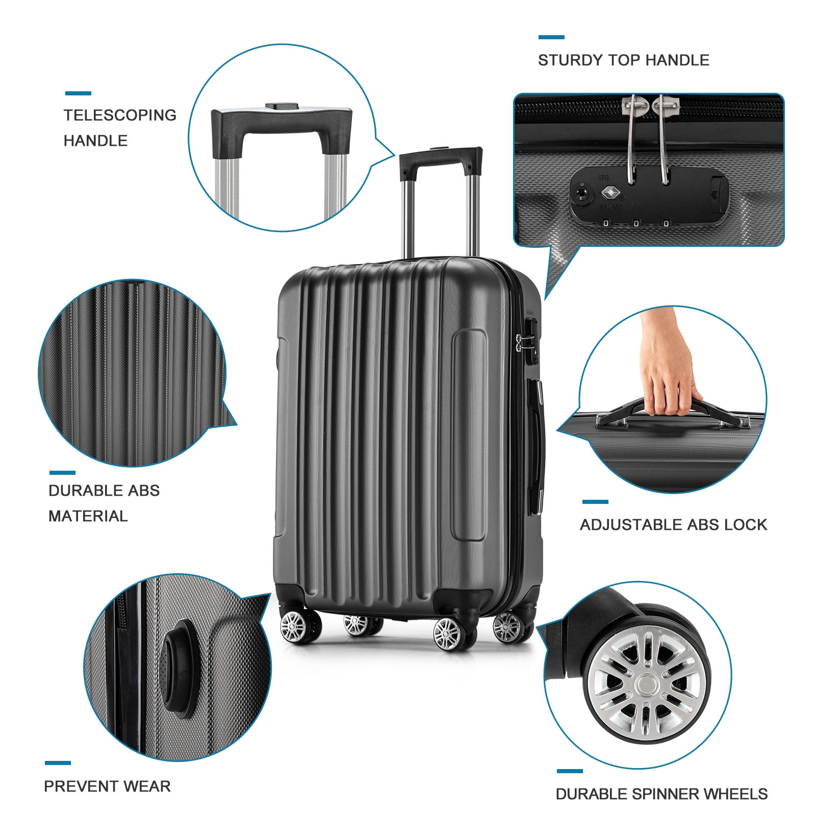 Features: ABS material, durable and lighter hard shell, features a textured finish to prevent scratches 16in & 20in is best for carryon, 24in & 28in expands 20% for more Spaces.Capacity : 16in28L 20in33L 24in63L 28in93L Adjustable & sturdy ergonomic aluminum 3-step telescoping handle allows you to maneuver in tight spaces and provide effortless movement TSA lock which allows only TSA agents to inspect your bags without damaging the lock Zippers are not easy to be pierced by sharp tools, such as pens, which protects your stuff in your luggage and privacy better Full-zip interior divider and cross straps for increased packing organization The 3-digit combination lock keeps your valuables secure, and convenient to pass the security check The structure is simple beautiful outlook, strong use, Bearing strength Made of brand new ABS materials for hardshell, which makes the luggage more durable Luggage moves very silent and smoothly with 360-degree rotating double wheels Specifications: Material: ABS Color: Rose Gold/Black/Dark Gray Weight: 317.47oz / 9000g Dimensions: (29.53 x 18.90 x 11.81)” / (75 x 48 x 30) (L x W x H) 16″: (8.66 x 12.5 x 19)” / (22 x 32 x 48)cm (L x W x H), 4.6 lbs / 2KG 20″: (8.66 x 13.78 x 21.65)” / (22 x 35 x 55)cm (L x W x H), 5.29 lbs / 2.4KG 24″: (10.24 x 15.75 x 25.59)” / (26 x 40 x 65)cm (L x W x H), 6.83 lbs / 3.1KG 28″: (11.02 x 18.9 x 29.53)” / (28 x 48 x 75)cm (L x W x H), 8.16 lbs / 3.7KG Package Includes: 4 x Suitcases Attention: There may be a deviation of 2-3cm due to the different measurement methods There are 4 pieces of luggage, the 16in, 20in, and 24in luggage come packaged inside the largest 28in luggage. They arrive in one box
