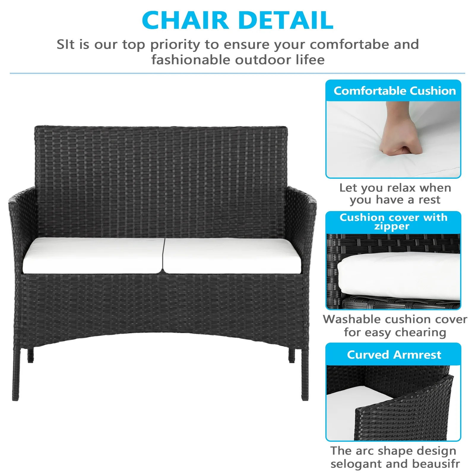 Features: Upgraded Comfort of Chair: The armrest and backrest are designed in curved shape and they will protect and relax your back and arm. Sturdy & Durable Structure: The frame of our furniture set is constructed of strong iron, which ensures sturdiness and stableness of the set. Comfortable Cushion with Washable Cover: Equipped with high elasticity and padded cushions, the seat is really comfortable to sit on and you won’t feel tired even if you sit for long time. Easy toClean: Even the cover is dirty, it is convenient to be taken off with zipper and be cleaned by machine or hand. Specifications: 1. Material: PE Cane Iron Polyester Cloth Upright Cotton 2. Color: Black 3. Cushion Fabric: Polyester 180g White 4. Upright Cotton: 1000g 5. Glass: 5mm Thick Tempered Glass 6. Rattan:8.5×1.1PE Rattan (Black Four-Thread Rattan) 7. Single Chair: (23.03 x 21.26 x 32.28)” / (58.5 x 54 x 82)cm(L x W x H) 8. Double Chair: (39.76 x 21.26 x 32.28)” / (101 x 54x 82)cm(L x W x H) 9. End Table: (27.95 x 16.14 x 15.35)” / (71 x 41 x 39)cm(L x W x H) 10. Total Weight: 51.26lbs / 23.25kg Package Includes: 2 x Single Chair 1 x Double Chairs 1 x Tea Table 2 x Single Seat Cushions 1 x Double Seat Cushions 1 x Glass