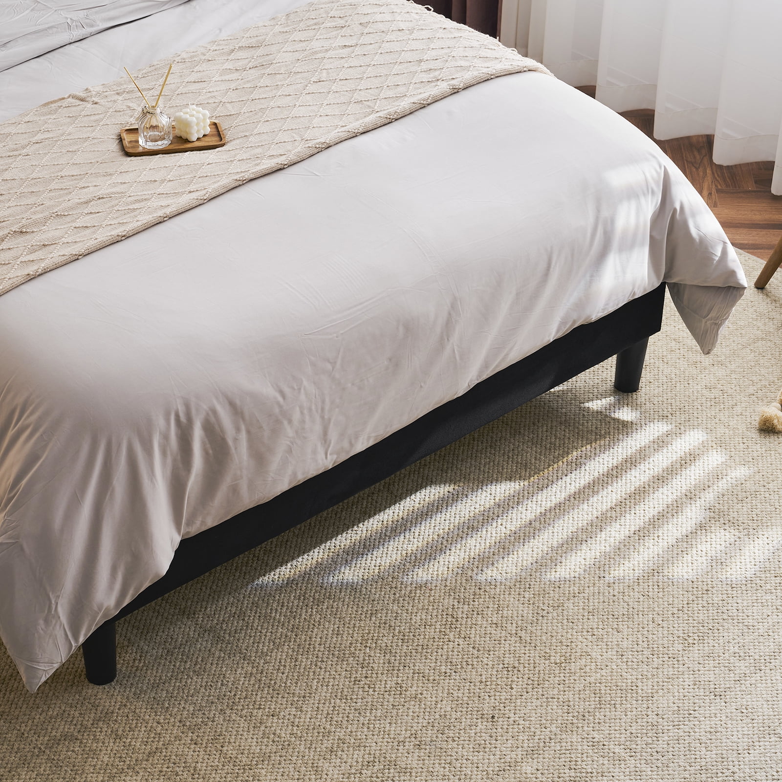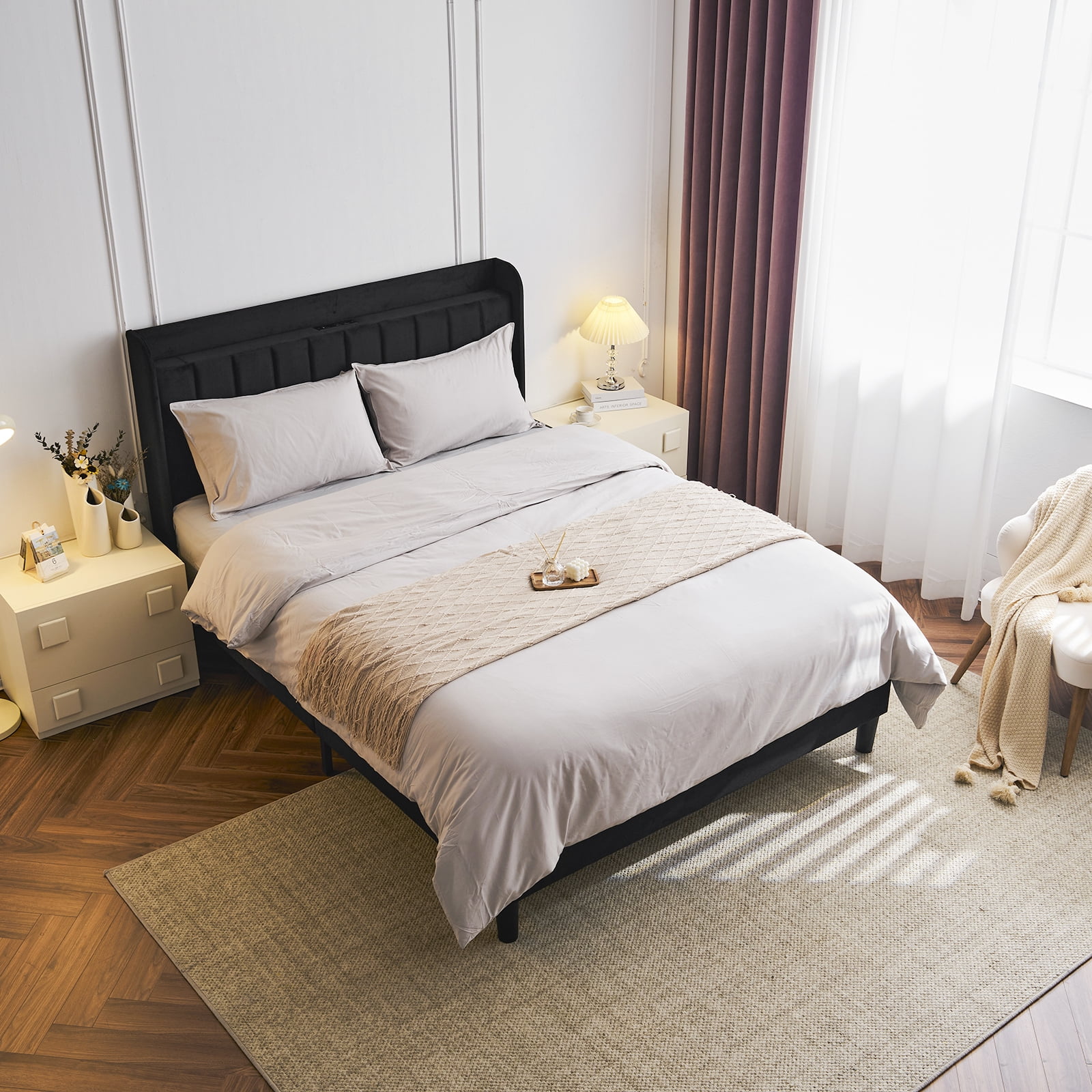 Introductions: Transform your bedroom into a sanctuary of comfort and convenience with our Upholstered Platform Bed, where innovative design meets timeless elegance, ensuring a restful and rejuvenated sleep every night. This bed frame features a built-in charging station and a practical storage shelf, ensuring your essentials are always within arm’s reach. The exquisite vertical channel tufted wingback headboard, enveloped in smooth velvet and plush sponge, offers both superior comfort and a sophisticated aesthetic to your sleeping haven. Features: 1. Convenient Charging Station: Standard plug sockets and USB ports are seamlessly integrated within the design, ensuring your electronic devices are always charged and within reach. 2. Smart Storage Solution: The thoughtfully designed storage area located above the headboard offers a secure and accessible space for storing essentials like phones, remotes, and glasses, keeping your personal items organized. 3. Luxurious Comfort and Style: The bed frame is crowned with a vertical channel tufted wingback headboard, wrapped in soft velvet and plush sponge, adding a layer of sophistication and comfort to your bedroom’s aesthetic. 4. Robust Construction: Constructed from high-quality metal and reinforced with center support legs, this bed frame provides a stable and durable foundation for your mattress. 5. Quick and Simple Assembly: Enjoy a hassle-free setup with our user-friendly assembly process, designed to get your bed frame ready in no time, without the need for a box spring, making it a convenient choice for modern living. Specifications: 1. Dimensions: (80.7 x 55.5 x 47.6) in / (205 x 141 x 121) cm (L x W x H) 2. Weight: 64 lbs / 29 kg 3. Color: Black Package Includes: 1 x Bed Frame