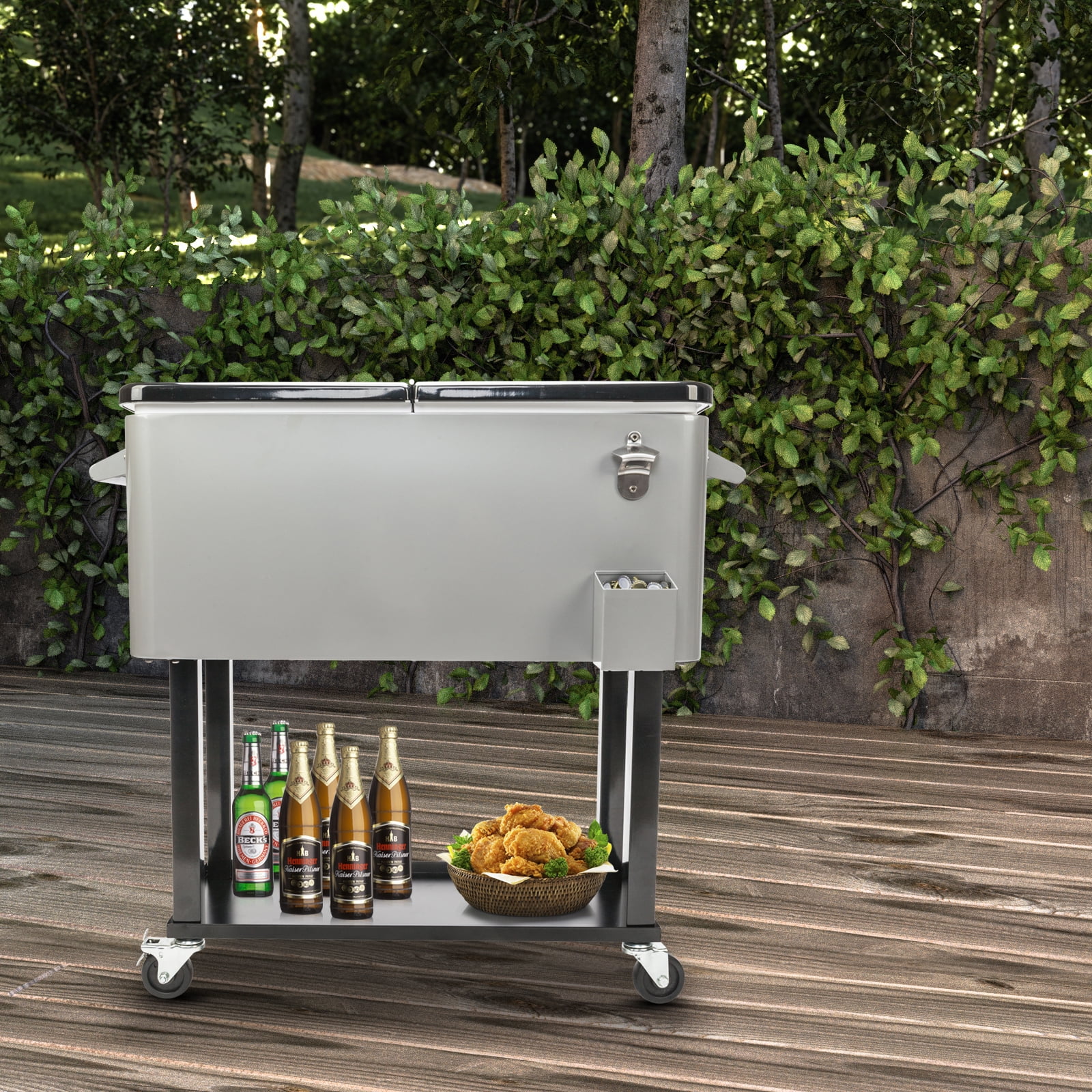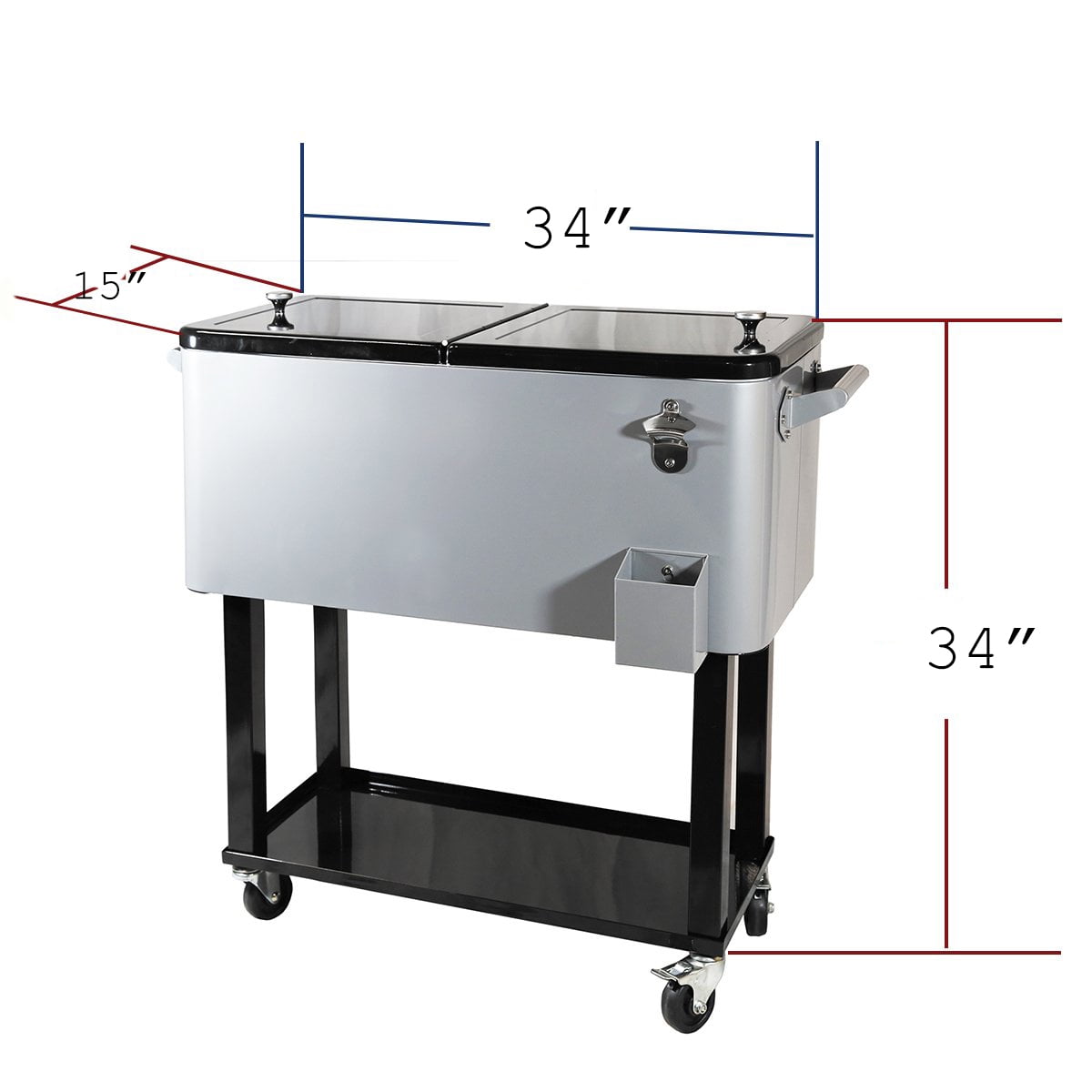 OVERSIZED 80 QUART ROLLING PATIO COOLER : holds up to 100 cans / 50+ bottles. Bottom shelf provides additional storage space. Perfect for any outdoor and indoor events like backyard barbeque or pool party MULTI DIRECTIONAL ROLLING WHELLS: Rolling Ice Chest comes with 4 multi directional rolling wheels. 2 wheels with lock secure cooler in place, easy to move. Wheels can turn 360 degrees. Solid metal side handles for carry or pull. Cooler box separates from the base for a completely portable unit MATERIAL: Solid all welded steel construction, Durable and smooth powder coated finish .Bottle opener with bottle cap catcher attached to side,Increase portability KEEP COOL: Featuring Refrigeration Insulation, This Cooler Cart Will Keep Your Drinks Cool For A Longer Duration, Which Can Reach Keep cool for 48hrs and keep warm for 8hrs EASY For DAILY USE: Drain plug removing excess water, for easy cleaning and care. Installation without tools.Simple assembly required but all necessary hardware is included