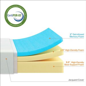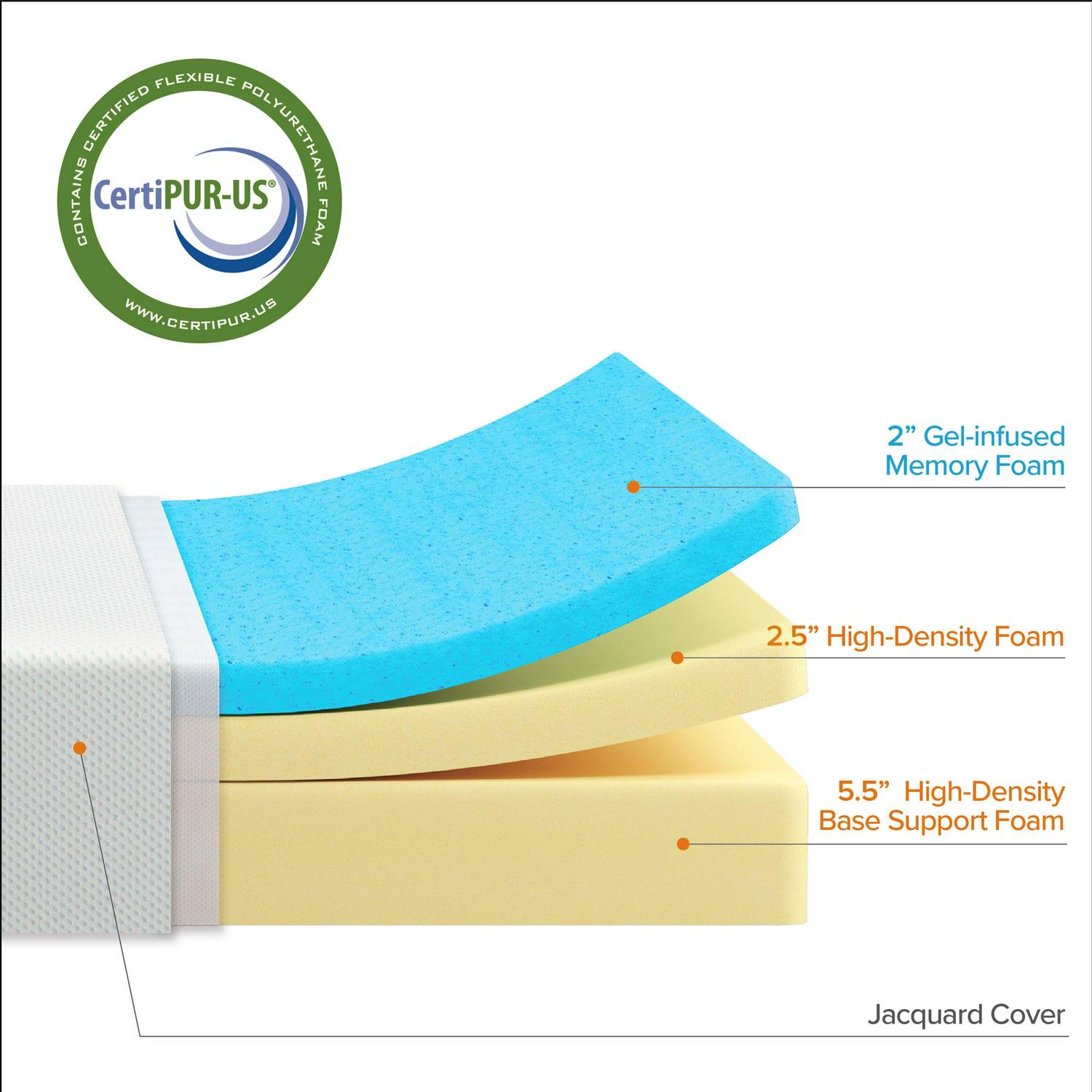 Note: Please allow hours for your Mattress to regain its full shape. Any memory foam will expand faster in a warmer room. In cold temperature, at delivery, your mattress may take a bit longer to return to full sized from its compressed state.The expansion time of the mattress will vary as per the surrounding.Set Up: Simply take your mattress out of the box and enjoy watching it decompress. Jumping, walking, and sleeping on your mattress can speed up the process.,AS COOL AS IT GETS – Settle in to a bed made with our most cooling formula yet, promising perfectly temperature-regulated sleep and a clean feeling night after night, all thanks to our enveloping memory foam packed with cooling gel and green tea,PRESSURE-RELIEVING FOAMS Layers of ultra-cooling gel and green tea infused memory foam, soft comfort foam and durable, high density base foam,CERTIPUR US CERTIFIED – Highest quality foam is CertiPUR US Certified for durability, performance, and content,EXPERTLY PACKAGED – Our technology allows this mattress to be efficiently compressed into one box that s easily shipped and maneuvered into the bedroom simply unbox, unroll and this mattress does the rest, expanding to its original shape within 72 hours,Worry-free 10 year lid included twin mattress supports a maximum weight of 250 lbs, while all other sizes can support up to 500 lbs,Core Composition: 2 inch MyGel Memory Foam 2.5 inch Super Soft Foam 5.5 inch High Density Foam