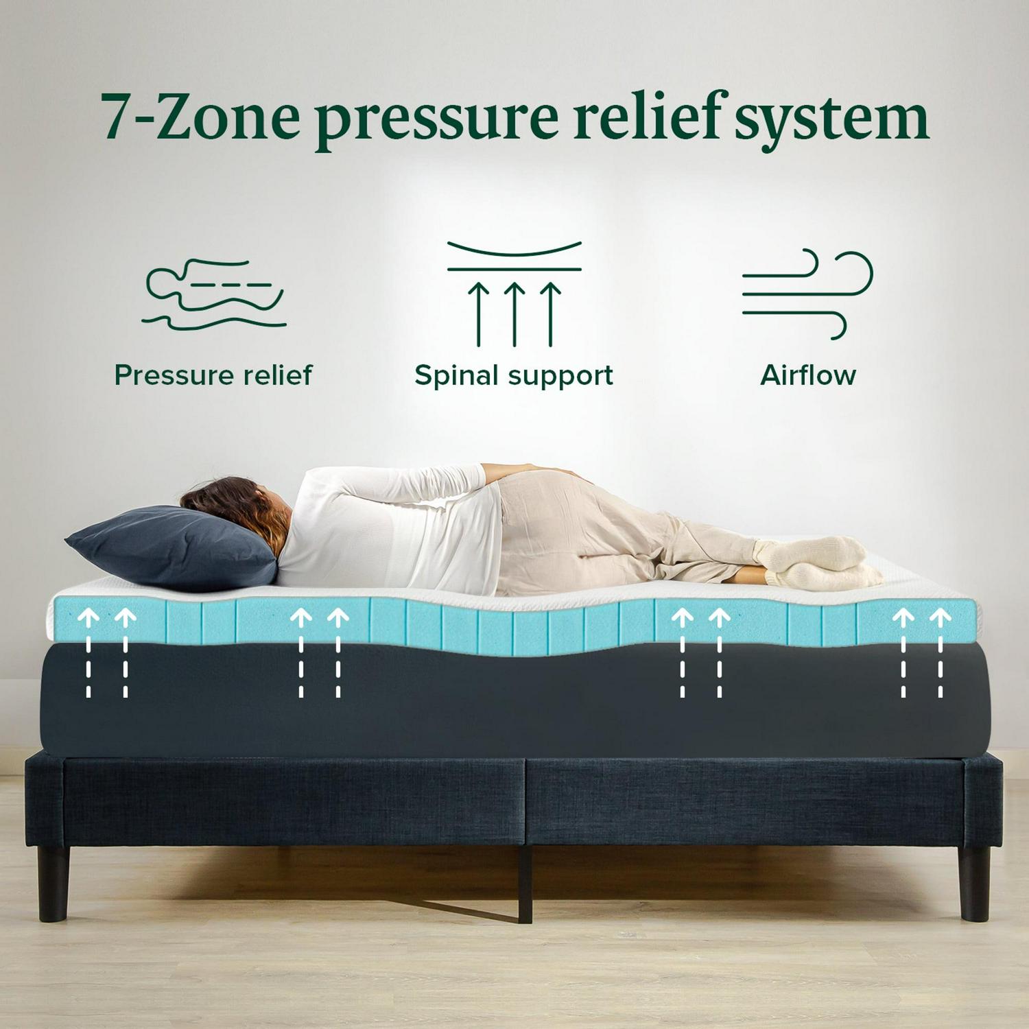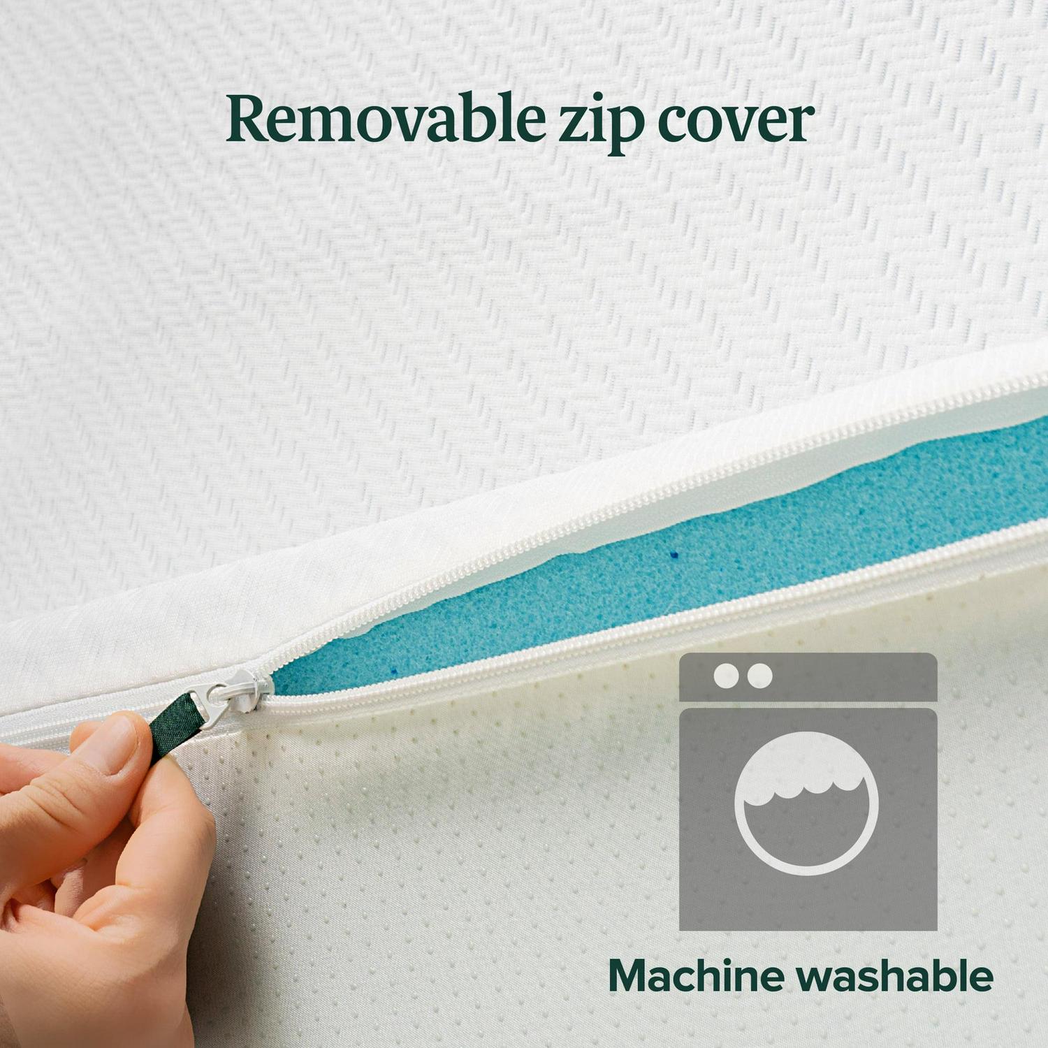 If you re suffering from hot sleeping or a mattress that leaves you feeling sore, the 7-Zone Cooling Gel Mattress Topper will put an end to your sleep woes. Crafted from a generous 4 inches of high quality cooling gel-infused memory foam, this exceptional topper keeps you feeling cool from the inside out. To support high pressure areas like the shoulders, hips, and knees, it s designed with Zinus patented 7-zone pressure relief system. You get extra softness under areas that need it most, and relief from aches and pains. The 7-Zone Topper includes an anti-slip bottom that helps keep everything in place. Its zip-on cover is removable and machine washable. Giving your mattress a cooling, pressure-relieving facelift is easier than you could ve ever imagined with this premium, sleep-enhancing layer.