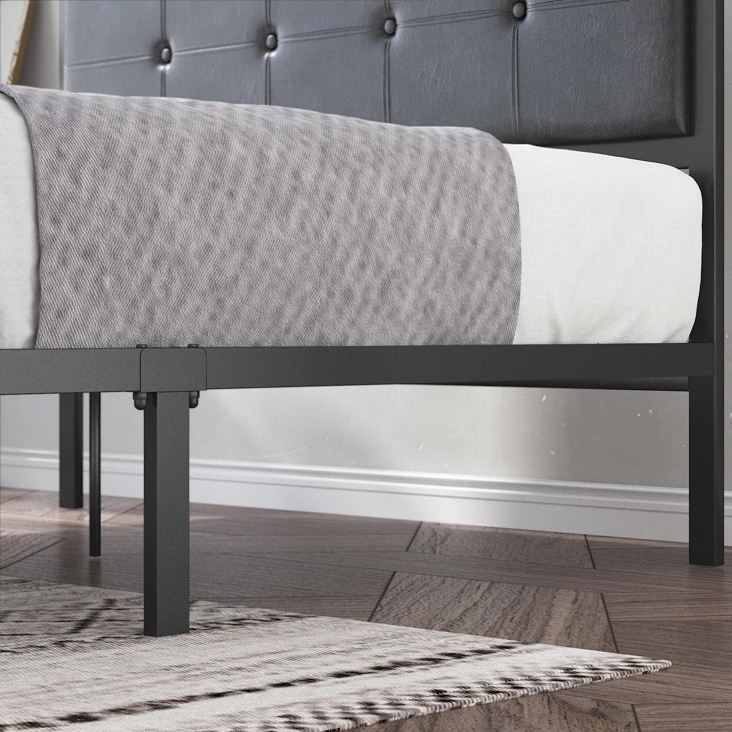 – Contemporary styling with faux leather headboard and metal frame