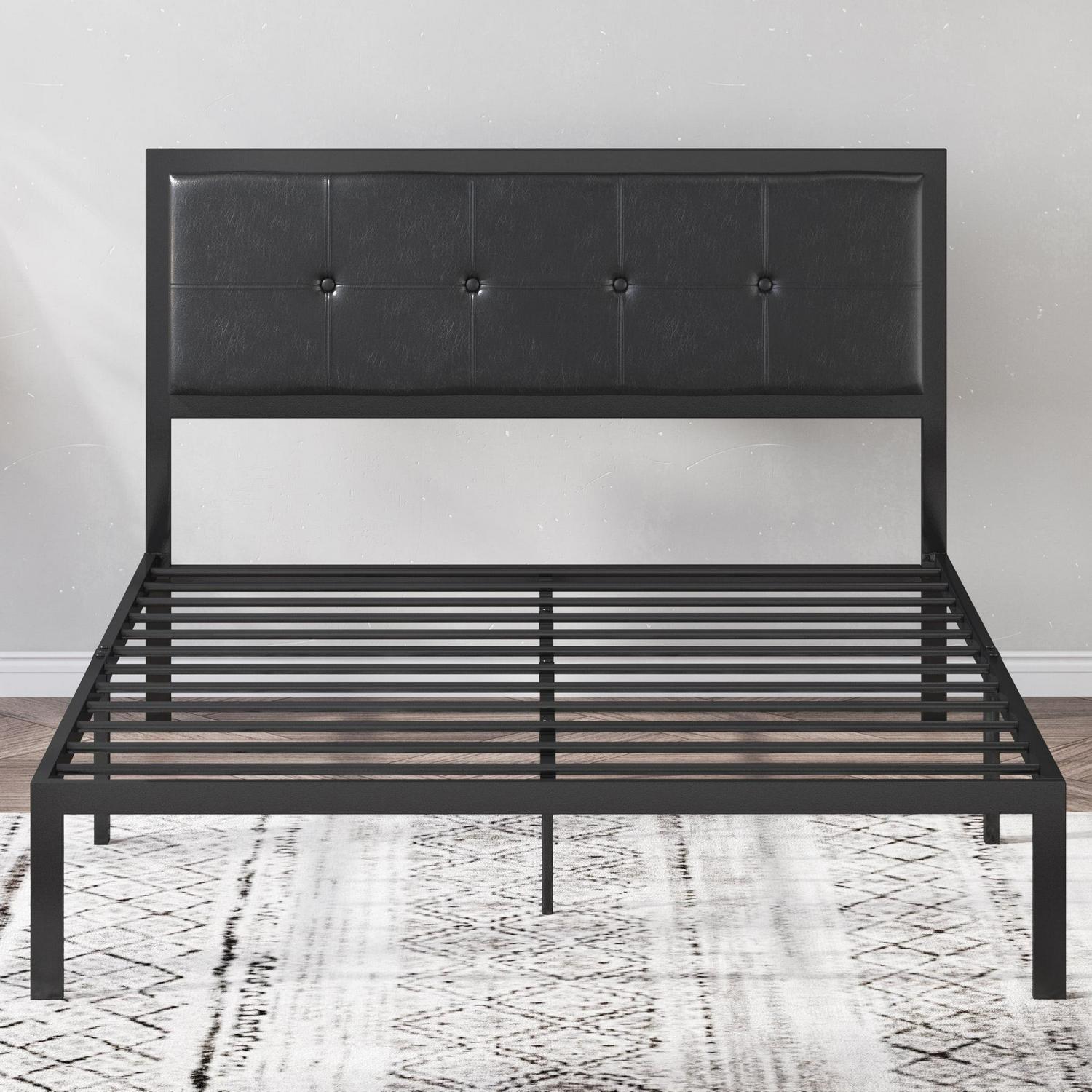- Contemporary styling with faux leather headboard and metal frame