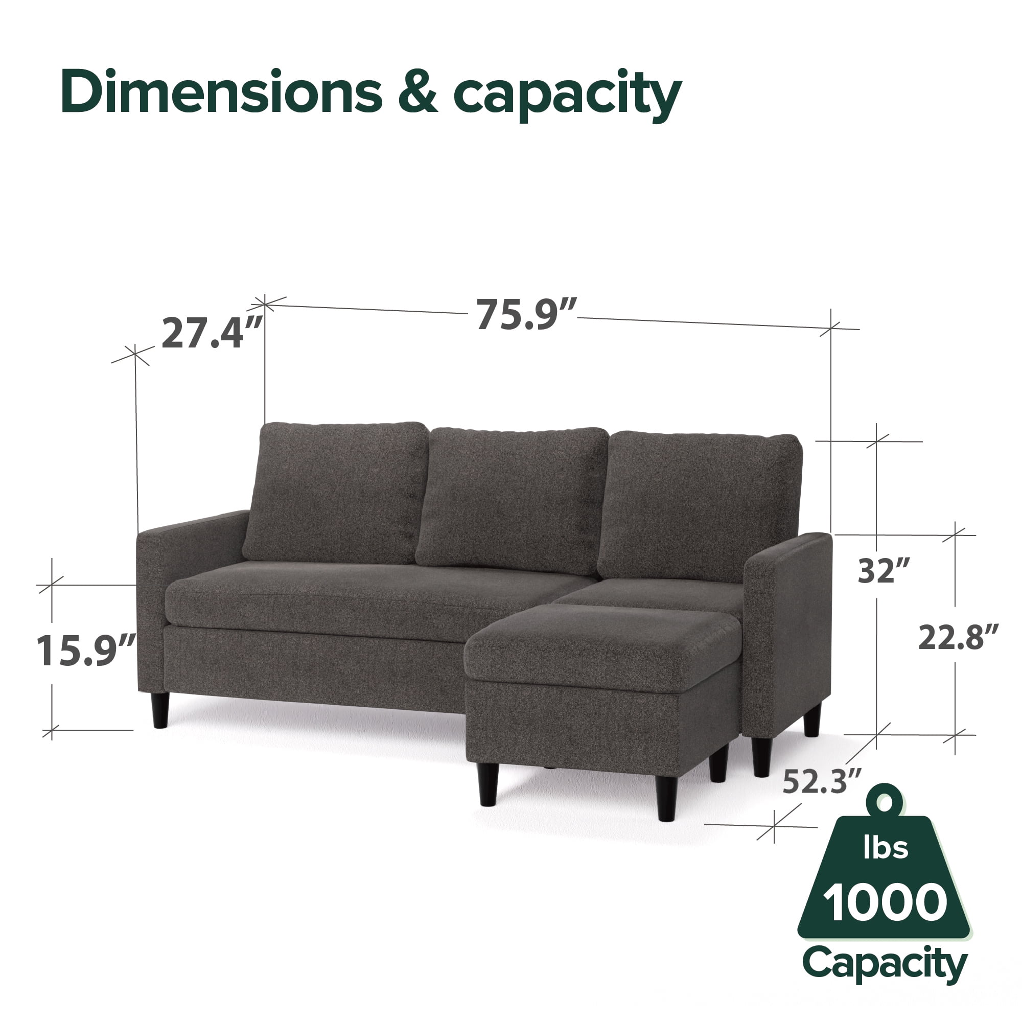 - Zinus Hudson Convertible Sectional Sofa with Reversible Chaise, Dark Grey