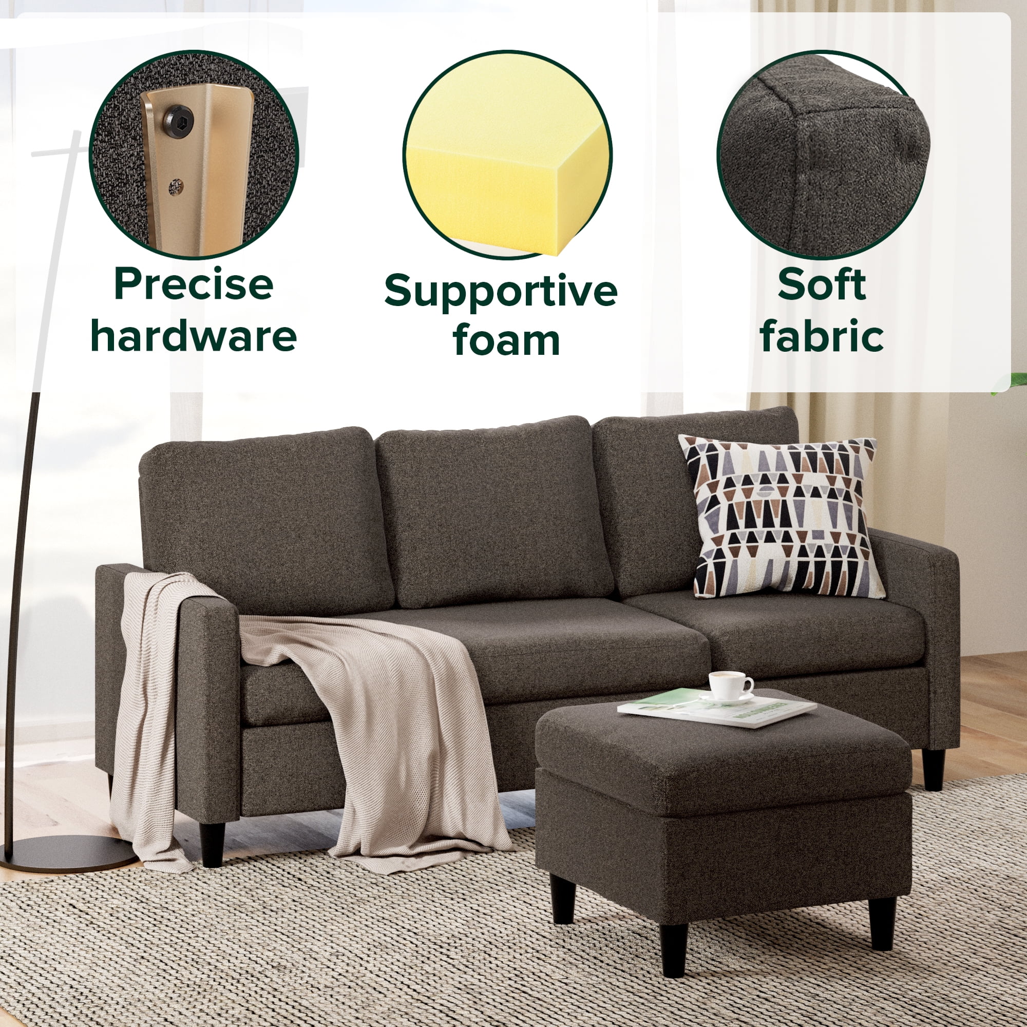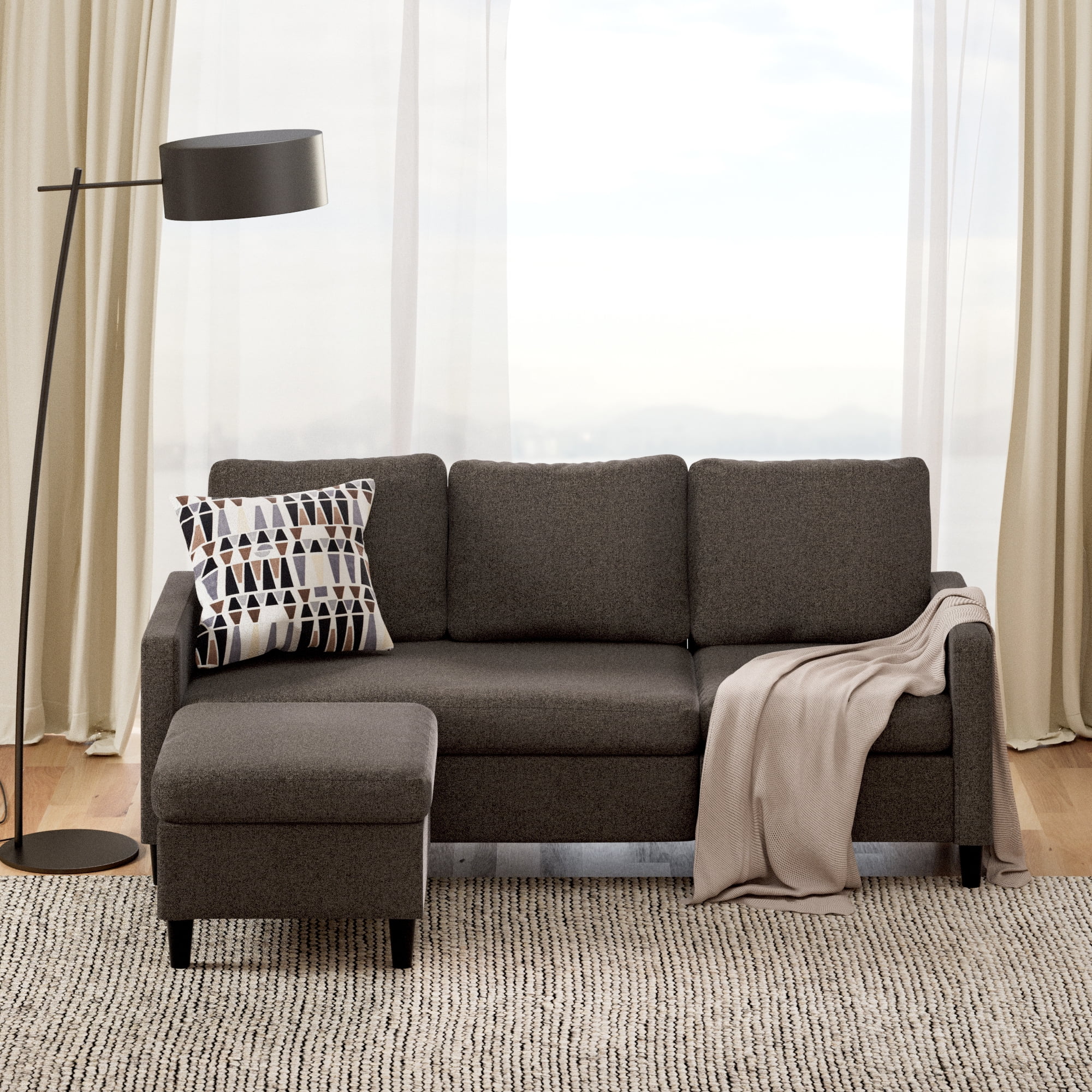 The Hudson Convertible Sectional features its own detached ottoman that converts to a chaise with the flip of a few cushions, so you can transition this sofa to fit your needs daily. Lie down and lounge by opting for the chaise configuration on whichever side you choose, or use the ottoman on its own as a coffee table or additional seat. It s made with a classic silhouette and dark grey upholstery to complement a variety of decorating styles, from traditional to modern. And with Hudson s comfortable foam cushioning, you ll enjoy supportive seating day in and day out. Designed to give you the functionality of a sectional even in smaller indoor spaces, this 76 inch sofa even ships to your door in just one box. Along with it, you get all the parts, tools, and instructions needed for quick and simple assembly. If you’re looking for a comfy sectional that fits both your living space and your budget, we think you ve found the one.