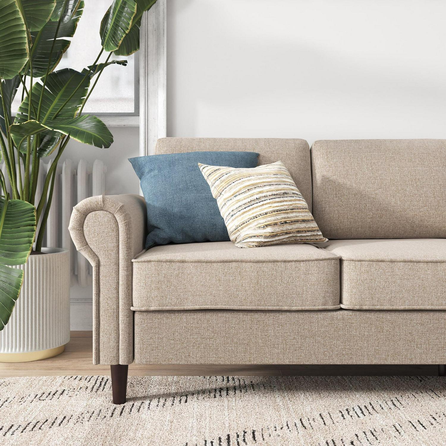Designed to make your home feel all the more welcoming, the Madison Sofa will become a staple in any space needing a dose of comfort and chic, polished style. This rolled arm couch features a soft silhouette, decorative stitching, tapered legs, and oatmeal beige upholstery made to pair beautifully with your existing interior. At 80 wide, you can easily seat 3 people on its supportive foam cushions with added soft padding made for hours of comfortable lounging. And the best part We expertly pack this sofa into one shipping box that arrives at your doorstep. In just a few simple steps, you ll be able to put it together in minutes without tools. With the Madison Sofa, you get extra comfy seating for the family in a sophisticated silhouette that ll never go out of style.