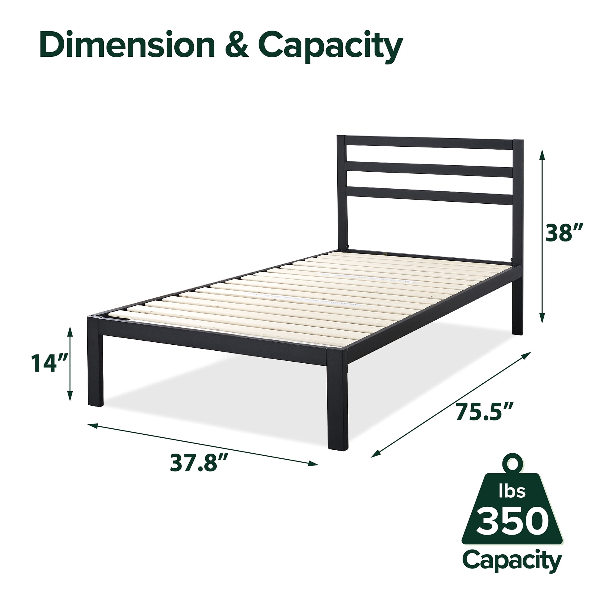 Strong mattress support prevents sagging and increases mattress life STYLISH AND STURDY – A sleek modern design and unbeatable durability, the Mia Platform Bed Frame checks all the boxes of an effortless upgrade to any bedroom DURABLY DESIGNED – With its all-steel framework, this sturdy bed frame is durably built to last you for the long haul; NO BOX SPRING NEEDED – Closely spaced wood slats provide reliably support and extend the life of your foam, latex, or spring mattress with no box spring needed; slats are spaced 3.1–3.4 inches apart EASY ASSEMBLY – All parts, tools, and instructions are efficiently packed and shipped straight to your door in one box for quick and easy two-person assembly that takes less than 1 hour 38 inches high with a 14-inch high mattress platform A mattress height of 10 inches or less is recommended Twin size supports a maximum weight of 350 lbs, while all other sizes can support up to 700 lb See our assortment of Zinus Foam Mattresses See our assortment of Zinus Hybrid/Spring Mattresses Twin Shipping Dimensions: 9.45″L x 4.33″W x 77.56″H, 51.46 lbs Full Shipping Dimensions: 15.55″L x 4.33″W x 77.56″H, 70.30 lbs Queen Shipping Dimensions: 15.55″L x 4.53″W x 82.87″H, 77.43 lbs King Shipping Dimensions: 15.94″L x 4.53″W x 82.87″H, 84.88 lbs