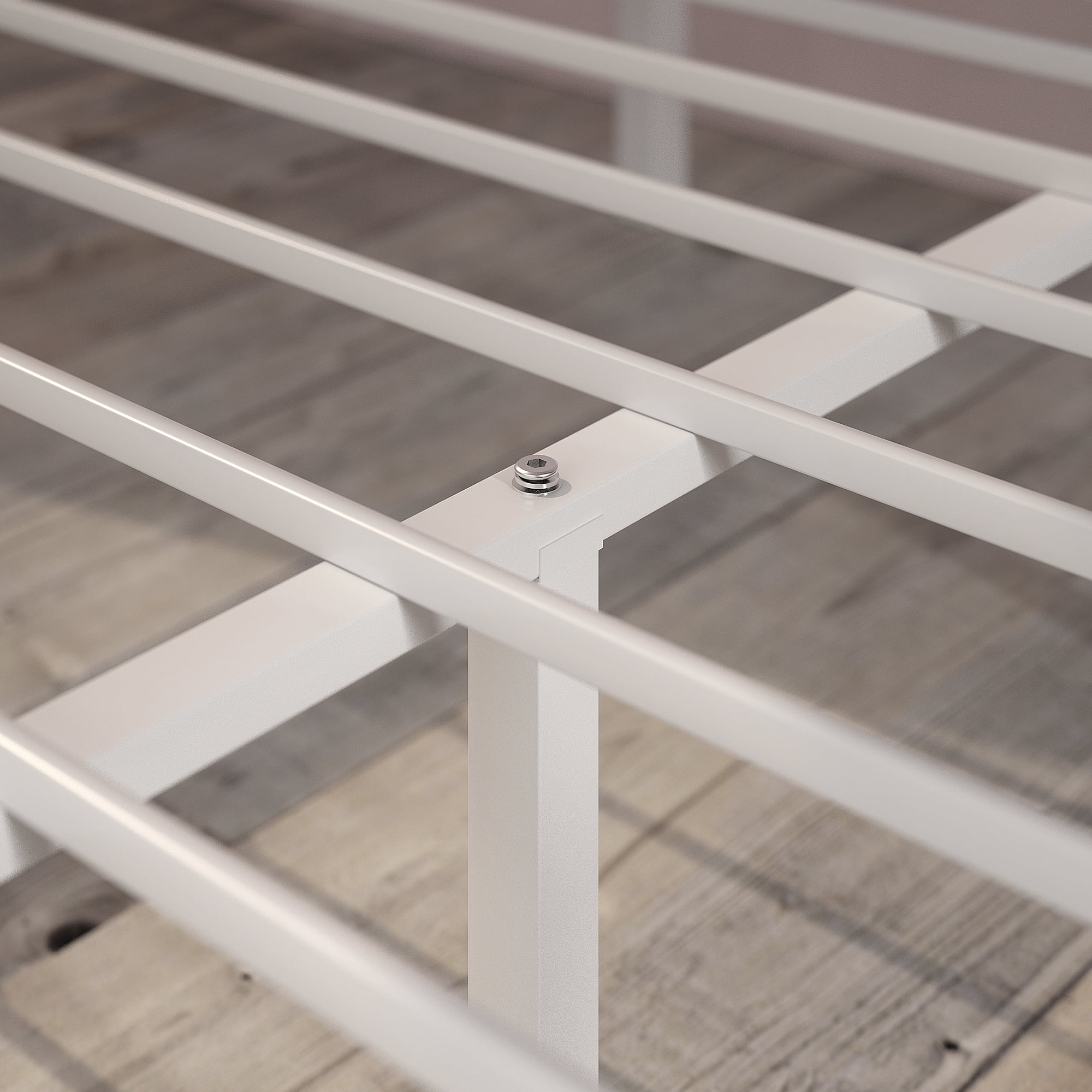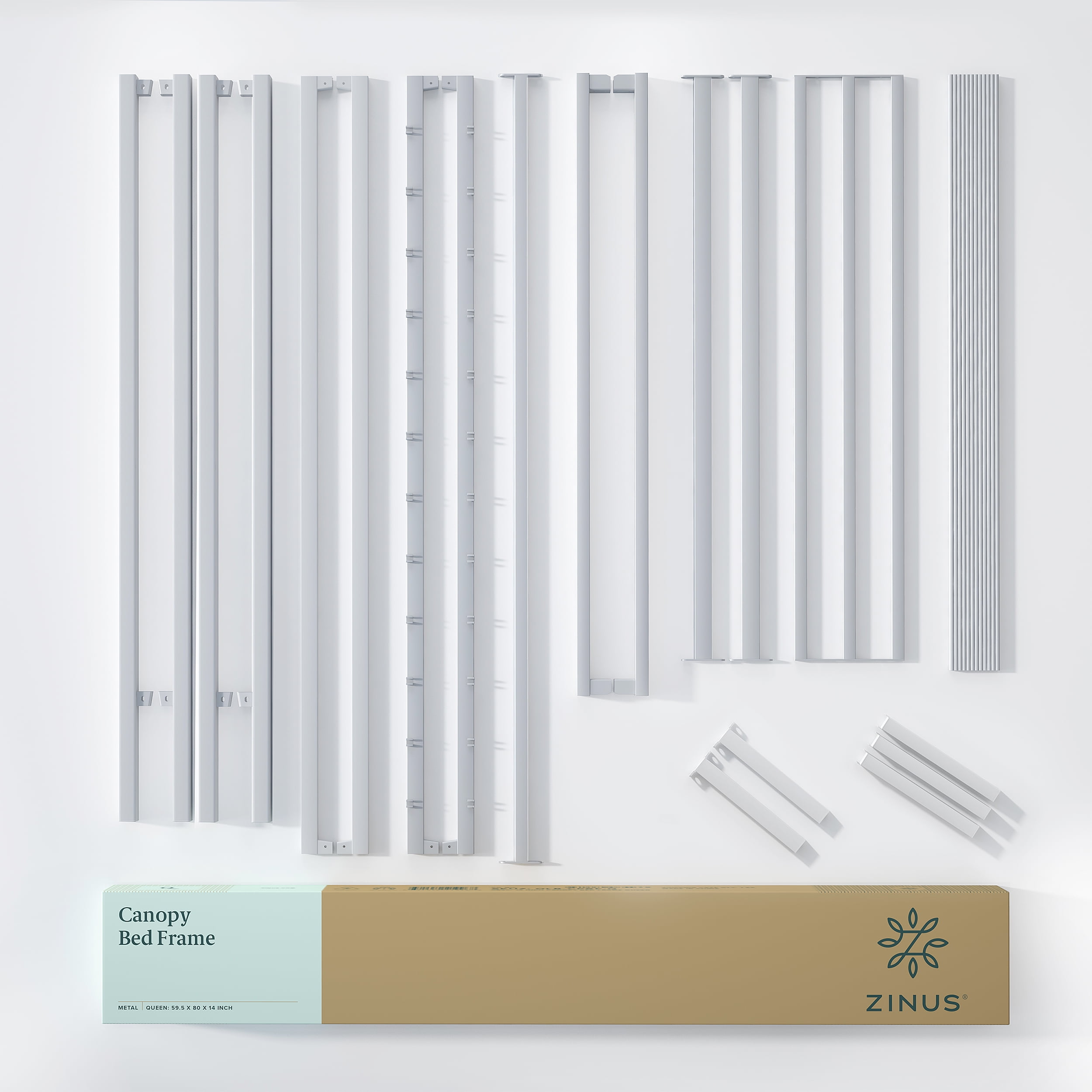 Zinus Patricia 72” White Metal Canopy Platform Bed Frame, Queen ELEGANT AND GLAMOROUS – This beautifully crafted piece is made with an attractive, matte finish and bold lines that’ll add a glamorous touch to your bedroom without the luxury price tag. DURABLY ENGINEERED – A solid steel canopy framework is durably designed and made for long-lasting, squeak-free use NO BOX SPRING NEEDED – Sturdy metal slats support and extend the life of your latex, memory foam or spring mattress without the need for a box spring; slats are spaced 5.5 inches apart for Twin/Full and 5.9 inches apart for Queen UNDERBED CLEARANCE SPACE – A 14 inch platform provides over a foot of clearance space perfect for storing odds and ends beneath the bed EASY ASSEMBLY – All tools, parts and instructions are expertly packed into one box for simple assembly with the help of a friend in under an hour Worry-free 5-year limited warranty included; mattress sold separately Product weight 85.32 lb. See our assortment of Zinus products