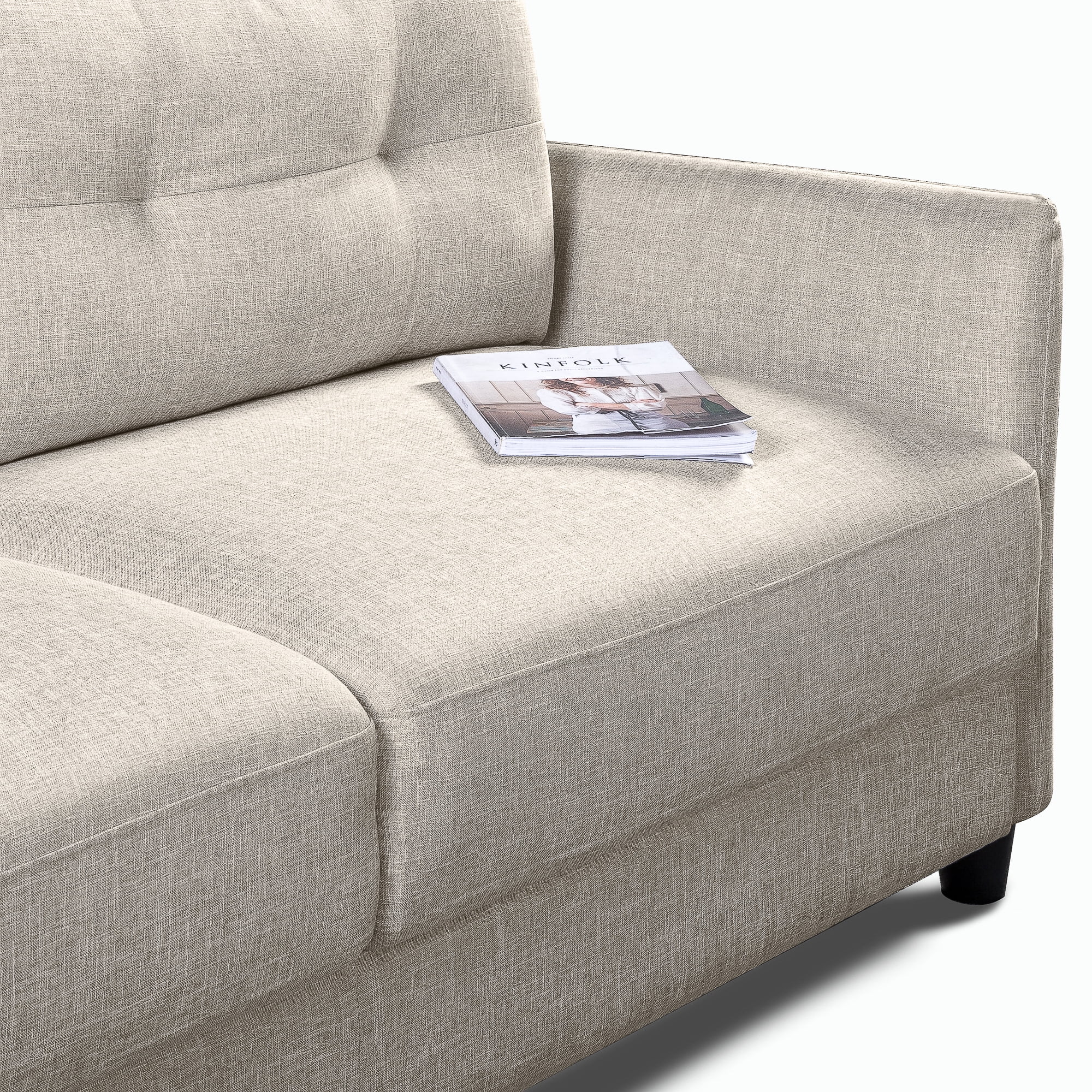 Zinus Ricardo Sofa, Beige CONTEMPORARY COMFORT, FRONT AND CENTER – Infinitely suitable for an array of spaces, the tufted Ricardo brings comfort and contemporary flair into your home and is available in a wide variety of shades, so it can strike the right “tone” wherever it sits BUILT TO LAST – A naturally strong frame is wrapped in supportive foam cushioning and durable woven fabric; seats a maximum weight capacity of 750 lbs; seat cushions are secured to the frame and are not detachable, while back cushions are detachable TOOL FREE ASSEMBLY – All parts and instructions are cleverly packed into one box for easy assembly in less than 20 minutes EASY CARE – Affixed cushions are easily cleaned with a clean, damp cloth and mild detergent; cushion covers are not removable Worry-free 1-year limited warranty included Age Group: Adult See our assortment of Zinus products