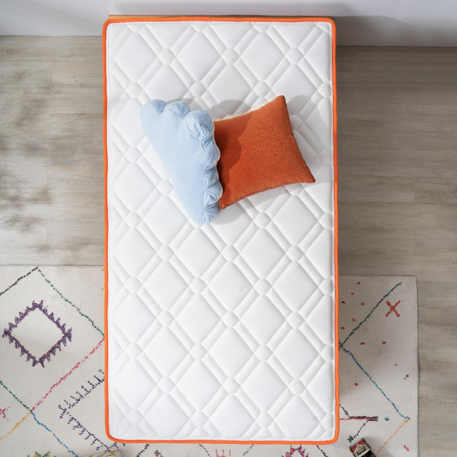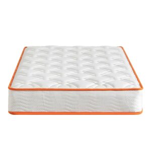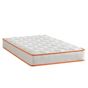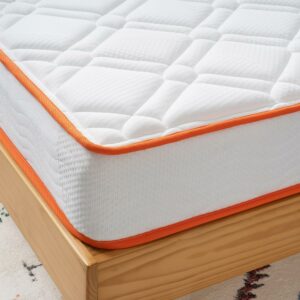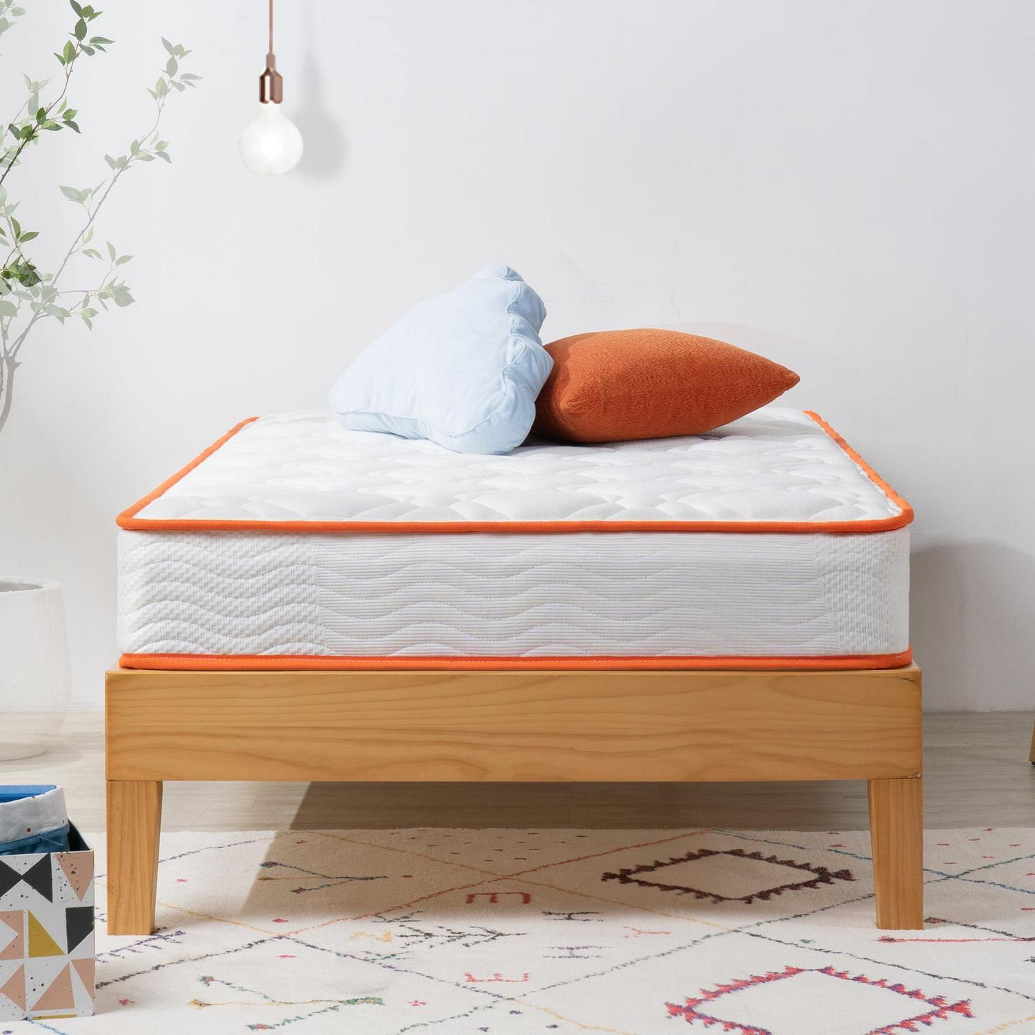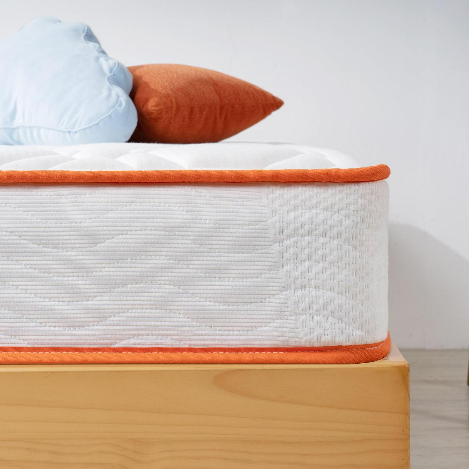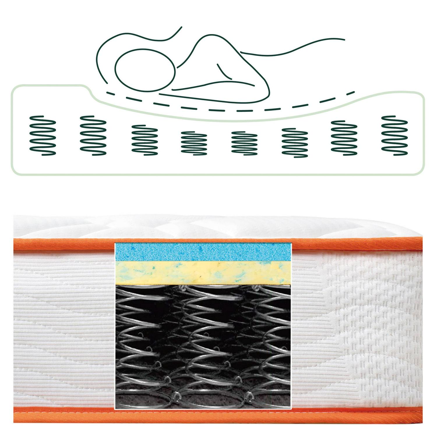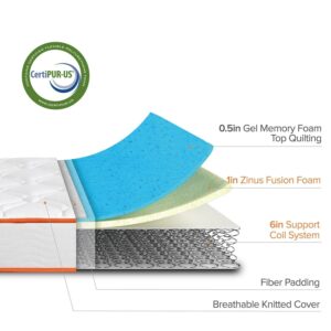 Comfortable sleep and affordability go hand in hand with the Gel-Infused Innerspring Mattress. It s made with fiber quilting and cooling gel memory foam on top for better comfort with no overheating throughout the night. Along with zero-waste Zinus Fusion Foam created from repurposed material, you get an ideal balance of softness and support. Support coils add durability and an even feel you ll rely on for many cozy nights to come. Its soft and breathable knitted cover has a striking orange trim. Comfortable for adults and kids alike, this mattress comes in 3 different profiles to suit any bedroom in the house. It s rolled and packed into one box that arrives at your door for simple setup, so you can sleep cooler and comfier in no time.