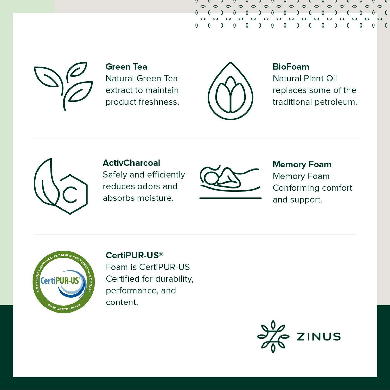 The Spa Sensations Theratouch Memory Foam Mattress Topper cradles you in comfort, as it molds to the natural shape of your body for customized sleep. Rejuvenate your current mattress or enhance your sleep experience with this dual layer memory foam topper. The latest evolution of memory foam, BioFoam, replaces some of the traditional petroleum with natural plant oil, and includes natural green tea extract and all natural active charcoal to help absorb moisture, eliminate odors, and keep your mattress topper fresh. Please open your mattress topper within 72 hours of receipt and allow 48 hours for it to return to its original, plush shape. Another comfort innovation from Zinus. Pioneering comfort. MFMT-400Q-CA.