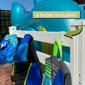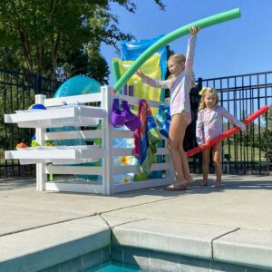 – TONS OF STORAGE SPACE: Main container has plenty of room for rafts, noodles, and large pool toys. Keep goggles and smaller toys organized with basket holders. Includes 6 moveable hooks to hang towels or other pool toys.