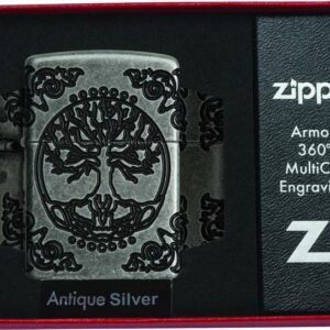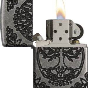 This harmonious MultiCut design set on an Armor Antique Silver finish lighter features the Tree of Life, connecting every living thing, past, present, and future to the Earth. The Tree of Life, one of the earliest examples of sacred geometry, represents the eternal link between space and time is shown on the back of this lighter. This genuine windproof lighter features a standard case with round corners, a flat bottom and a fitted insert with a standard insert. The distinctive bottom stamp authenticates this lighter as a genuine Zippo. Perfect for your purse, pocket or hand. Comes packaged in a gift box. For optimal performance, fill with Zippo lighter fuel.