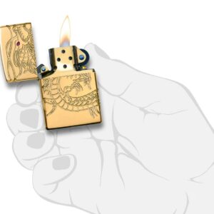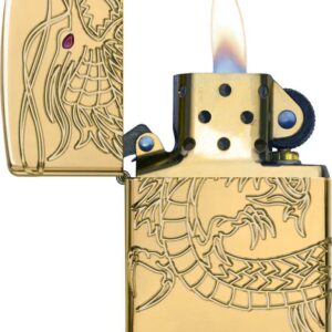 A seamlessly wrapped 360° multi cut engraving process across the front, sides, and back of an Armor gold-plated lighter brings this Asian dragon to life. A translucent red epoxy inlay and gold-plated inside unit add to the mystique. Genuine windproof lighters feature a standard case with round corners, a flat bottom and a fitted insert with a standard insert. The distinctive bottom stamp authenticates this lighter as a genuine Zippo. Perfect for your purse, pocket or hand. Comes packaged in a gift box. For optimal performance, fill with Zippo lighter fuel.