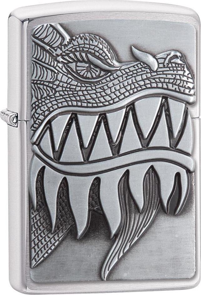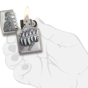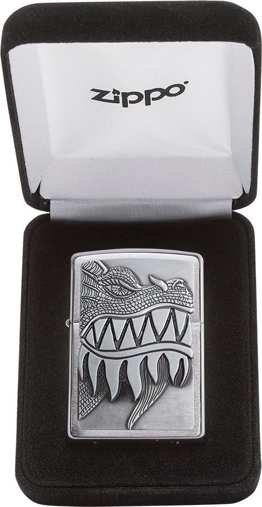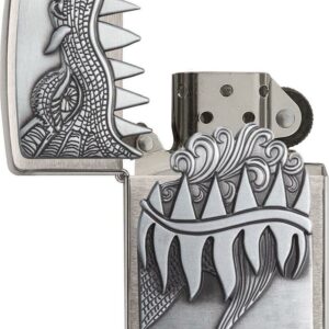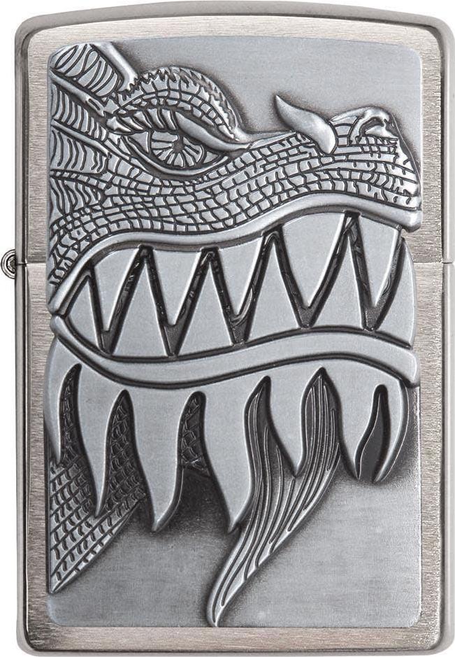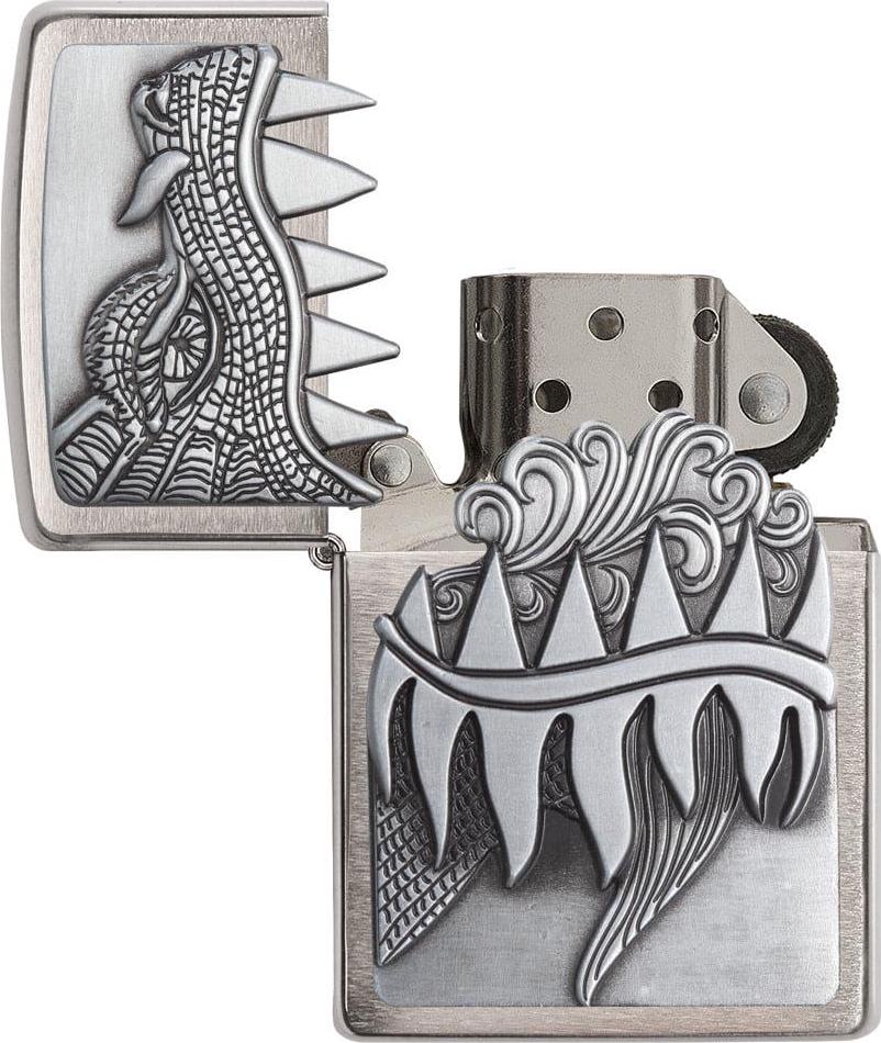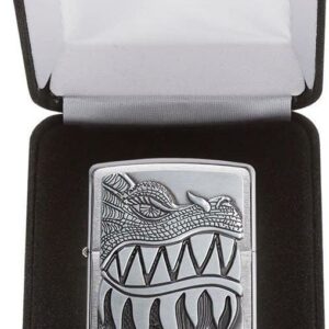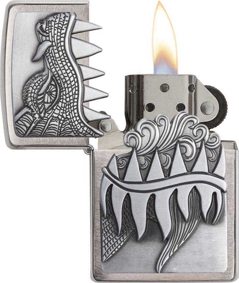 Look out! This Brushed Chrome dragon design features an attached emblem and a surprise – open the jagged teeth to reveal a fiery cloud of flame. Comes packaged in a gift box. For optimal performance, fill with Zippo lighter fuel.