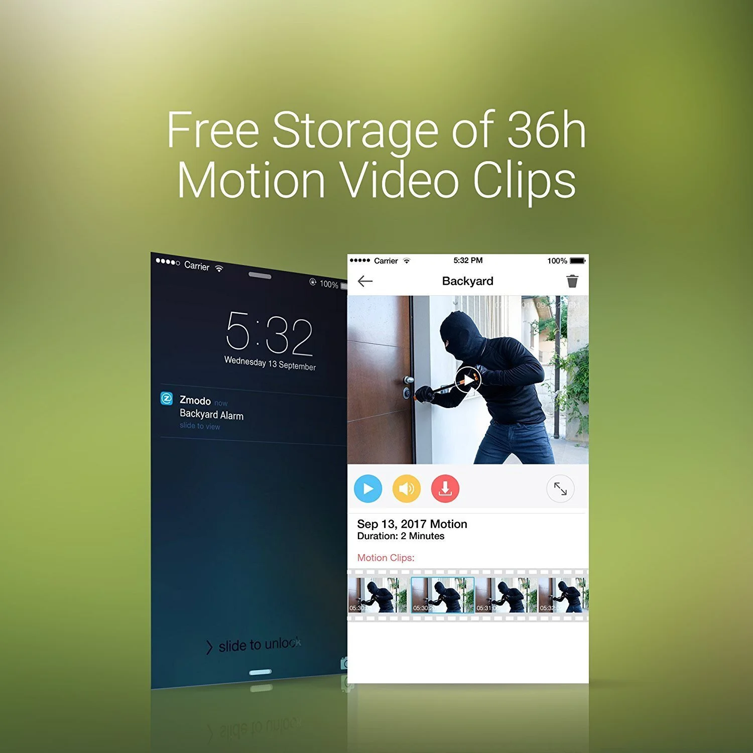 1080P Full HD non-stop monitoring get a crystal clear full-HD picture of your home from anywhere at any time and see up to 65ft away in the dark Smarter and adjustable night vision allows you to see the color image even in a dim environment by lowering the IR sensitivity Weather-resistant for outdoor this professional security camera is weatherproof with a supported temperature range From -10℃ to 50℃ can be placed both indoors and outdoors to protect every inch of your home through every season in rain or shine Works with Alexa Zmodo 1080P outdoor Wi-Fi camera works with Alexa Control Zmodo camera with your voice by saying “Alexa show me the front door” To view a live stream from your camera Zmodo cloud recording with a 1-month free trial instead of receiving just pictures you’ll be notified with video clips in Zmodo App when motion is detected Motion video clips are saved in the cloud Enjoy a free trial of 30-day of Zmodo 7 day cloud recording plan With the plan you can review save and share footage at any time and reduce false alerts with cloud intelligence US-based Zmodo Support 30-day money-back 1-Year and lifetime US-based tech support ( Tel 217-693-5706 Working time 8:00 – 20:00 CST Mon-Fri )
