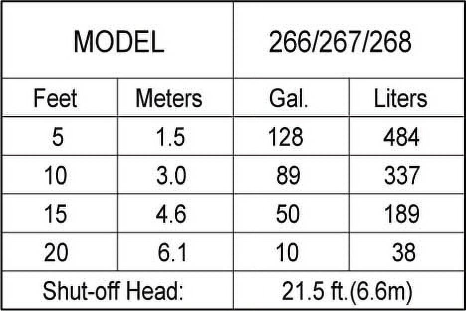Zoeller 267-0002 Specifications: Height: 14.28″ Length: 11.21875 Width: 13.0625″ Category: Sewage Pumps Connection Size: 2″ NPT Flow Rate: 128 gpm 1/2 HP motor Maximum Head Height: 21.5′ Voltage: 115V Weight: 52 lbs. Collection
