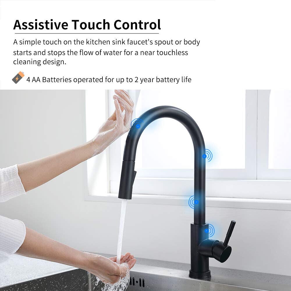 【Touch Control Technology】Unlike traditional kitchen faucets, you can effortlessly start and stop the water flow by simply touching the faucet body with your wrist, forearm, hand, or any other body part, providing you with greater convenience and a nearly contactless experience. 【Pull-down Sprayer】The faucet features a 19-inch extendable hose, providing excellent maneuverability for comprehensive cleaning of your kitchen sink. 【Two Water Modes】The faucet features two modes: aerated stream and powerful spray, allowing for effortless switching and perfect adaptation to various cleaning needs. 【Easy Maintenance】The use of 304 stainless steel material ensures the longevity of the kitchen faucet, making cleaning and maintenance easy and reducing your workload effectively. 【Services】Quickly connect the hose without the need for a plumber, allowing for easy self-installation and saving you installation costs. If you are not satisfied with our product, please contact us, and we will provide a full refund for you.