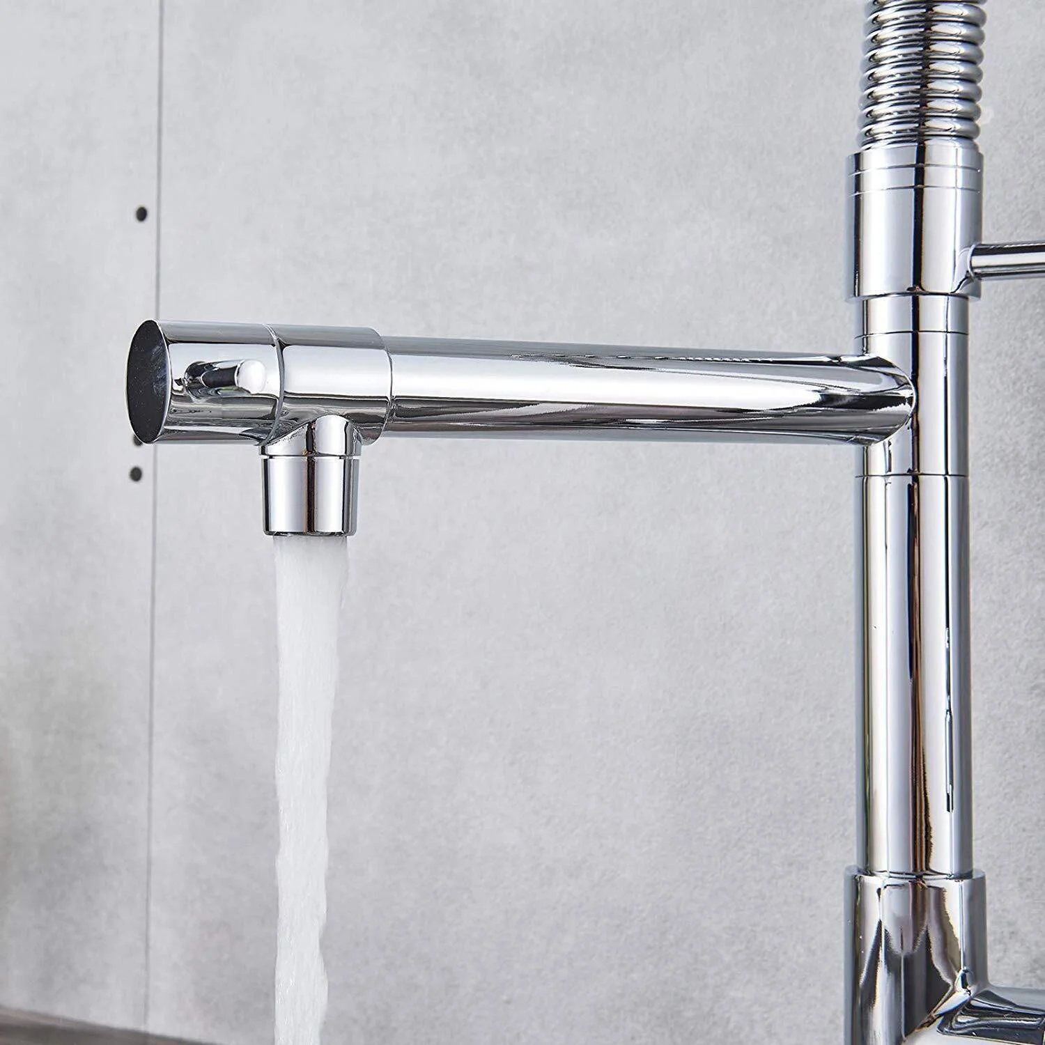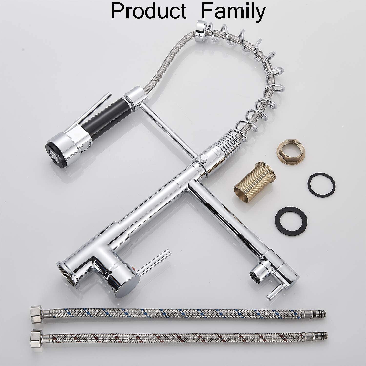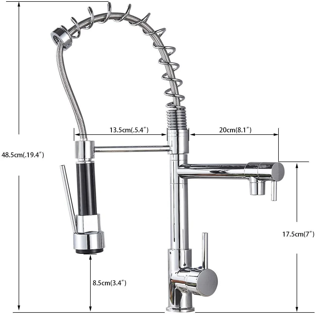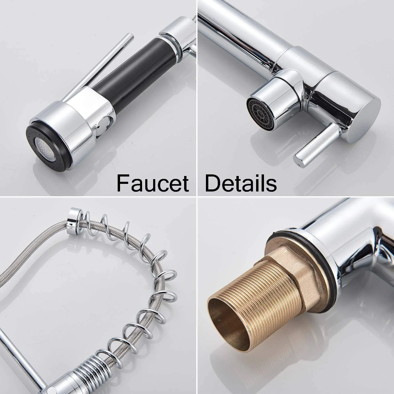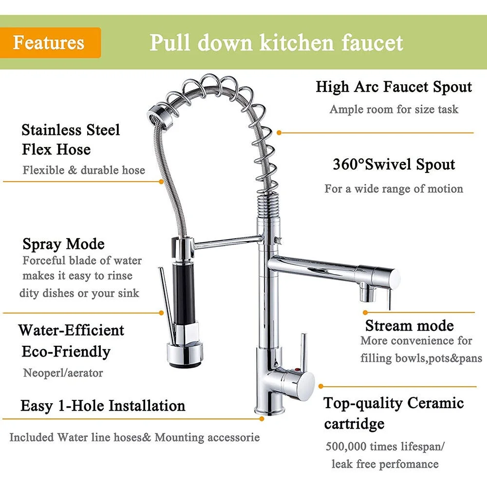 Function: Kitchen Spring Taps Style: Modern Finish: Chrome Feature: Pull Out Spray Material: Brass Number of Handles: Single Handle Installation Holes: One Hole Valve Type: Ceramic Valve Faucet Body Material: Brass Spout Material:ABS Plastic Water Feature: Mix Hot and Cold Installation Method: Surface Mount / Desk Mount Water Mode: One Spout with Stream Water,another Spout with Rainfall Water Water Pressures: Minimum 0.3 mpa, Maximum 1.5 mpa With 2 hoses for cold and hot water One Hole Easy Installation. Not included base plate to cover the sink holes. Please order separately. Fitting both 3/8” and 1/2” water supply hose. Quick connector make sure leak-proof. Durable Chrome Finish: resists tarnish and corrosion from daily use. Premium Ceramic Disc designer faucet: smooth stream/spray water flow, drip-free. Single Handle: easy control of hot and cold water. Pull Out Sprayer and 360 Degree Rotation: offer more room pots/pans and superior clearance for sink. Faucet Diameter:1.97 Inch (50 mm) Faucet Diameter To Fit The Sink: 1.4-1.8 inch (3.5-4.5 cm)