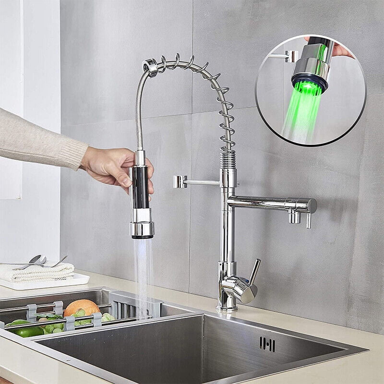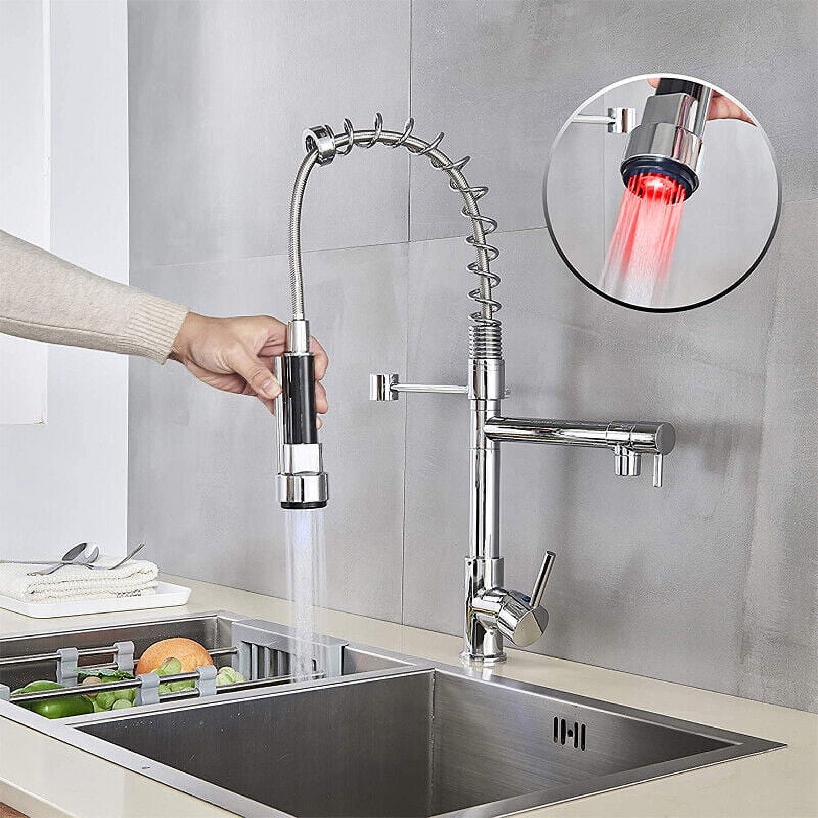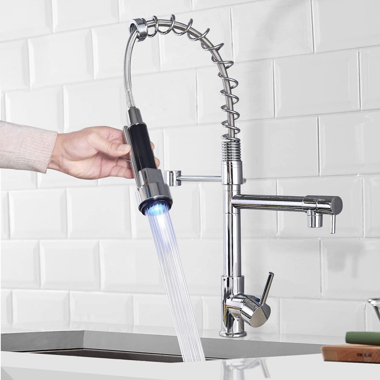 Zovajonia Commercial Kitchen Faucet with Pull Down Sprayer Single Handle Kitchen Sink Faucet with 2 Spout LED Light Polished Chrome