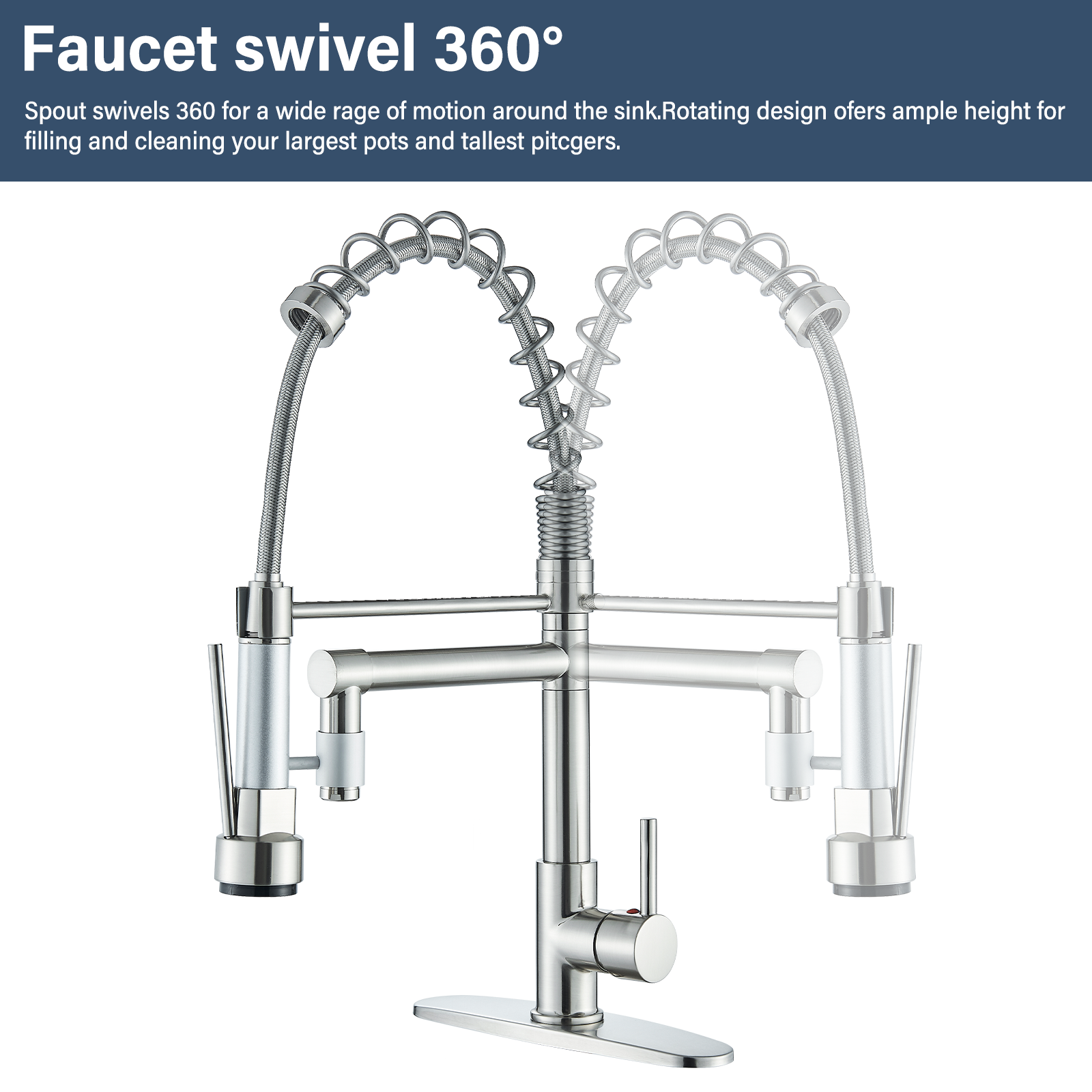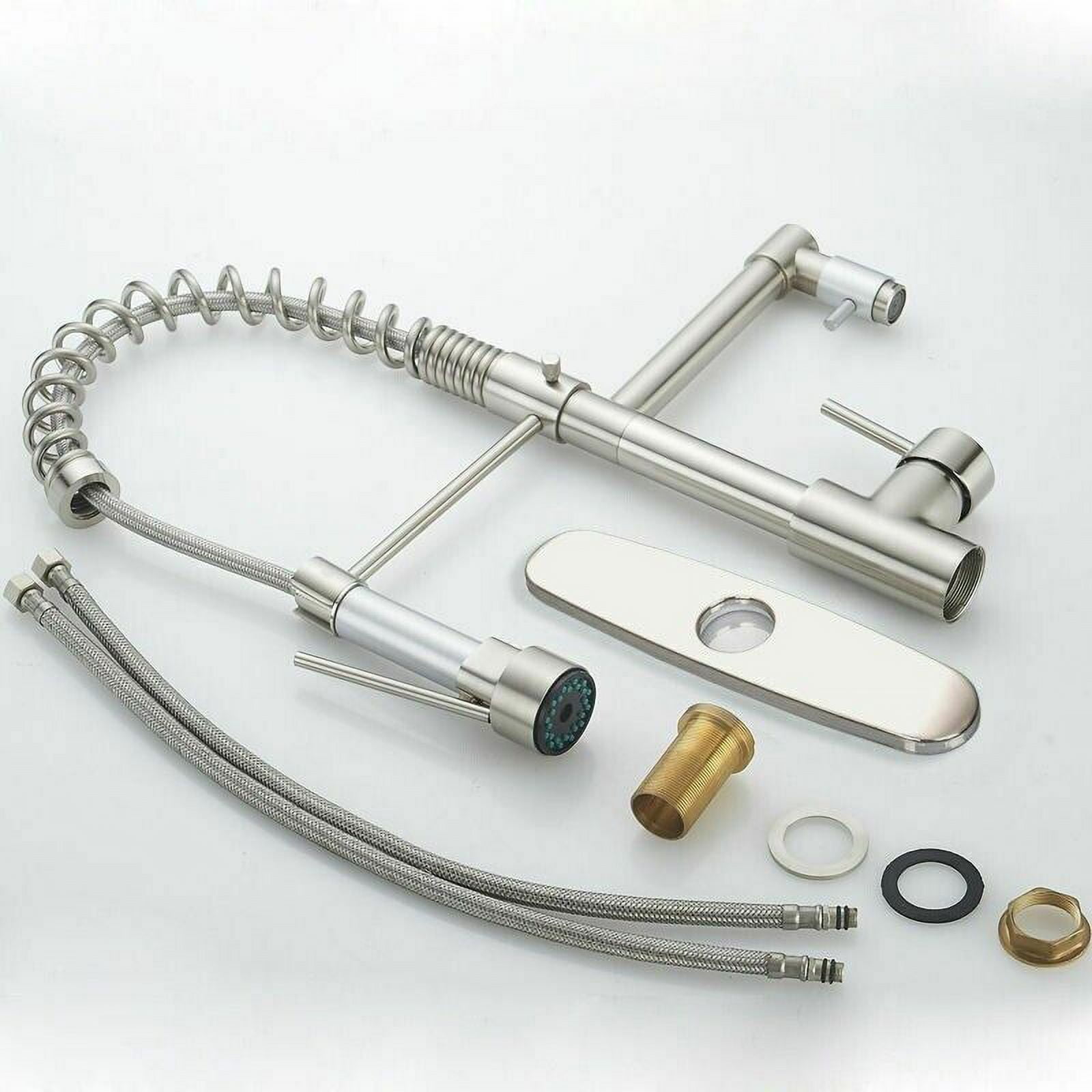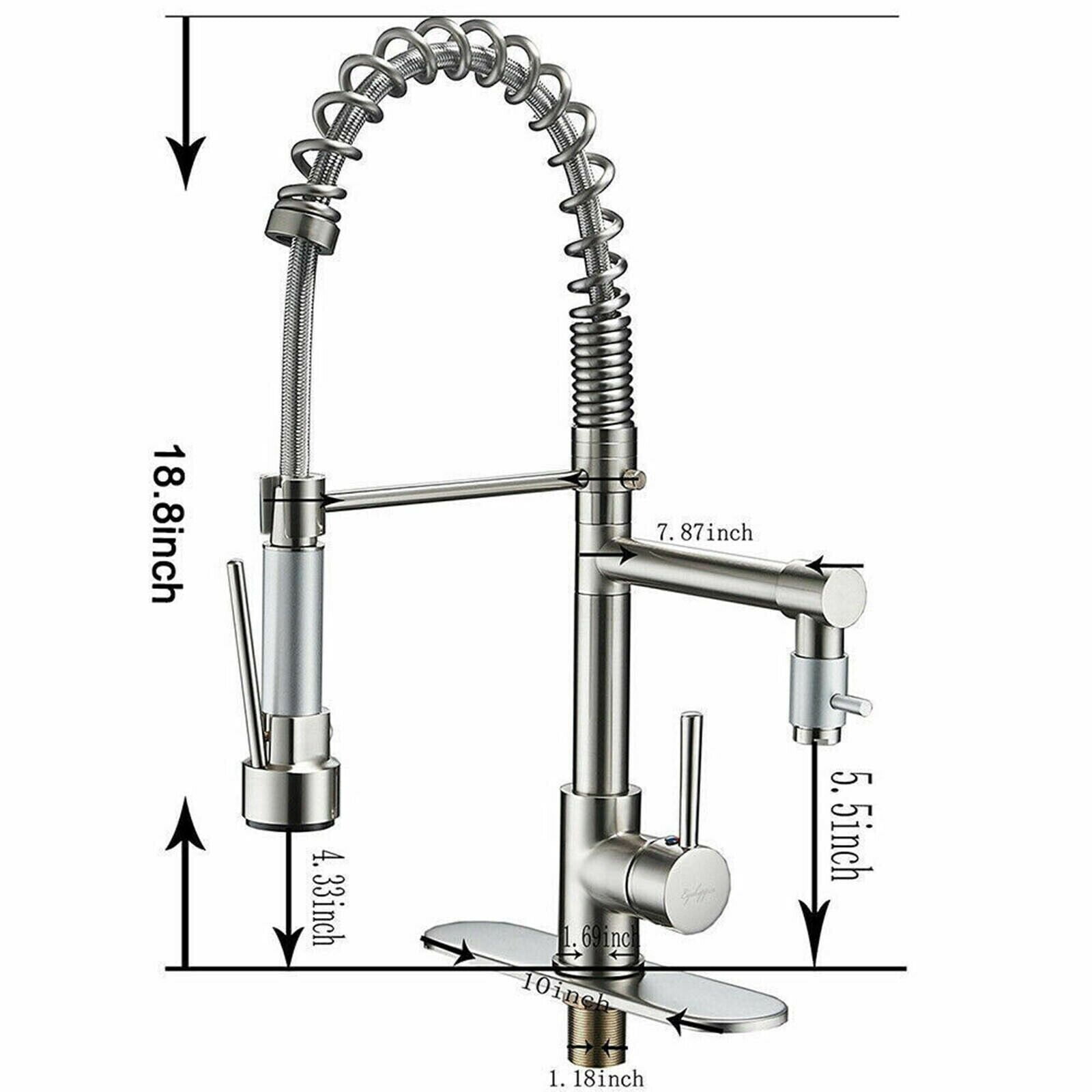 Function: Kitchen Sink Faucet Feature:Swivel Spout Finish: Brushed Nickel Number of Handles: Single Handle Installation Holes: 1 or 3 Holes Faucet Total Height: 18.8 ” Spout Height: 4.33 ” Cover :9.6 inch Valve Type: Ceramic Valve Faucet Body Material: Brass Faucet Spout Material: Brass With 2 pipes for cold and hot water. The installation hole is 3.5-4.2cm (1.38″-1.65″)