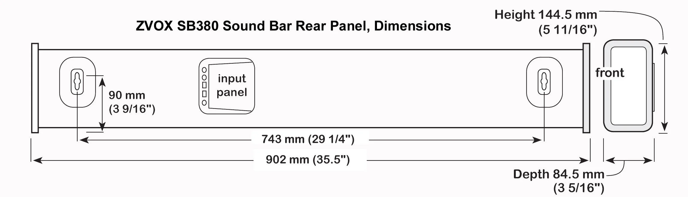 Key Features and Benefits: Great sound The SB380 uses a digitally controlled amplifier that uses complex algorithms to create superb sound. Unlike most affordable sound bars and TV Speakers, it employs high grade speakers with extremely accurate frequency response. All sound bars and TV speakers promise high performance sound. The SB380 delivers. PhaseCue virtual surround sound ZVOX’s proprietary PhaseCue virtual surround processing gives you rich, three-dimensional sound with movies or music. Disappearing display The SB380 features a four-digit display located behind the speaker grille that shows the current setting for volume, bass, treble and PhaseCue (virtual surround) – and also shows when you have engaged the Mute, Output Leveling (OL) or AccuVoice (ACCU) features. A few seconds after you stop using your remote (or front panel) controls, the display disappears completely. Elegant aluminum cabinet The SB380 features an extruded aluminum cabinet that is light but acoustically rigid. Because the cabinet has such thin walls, the internal volume is relatively large – allowing for big sound from a slim package.